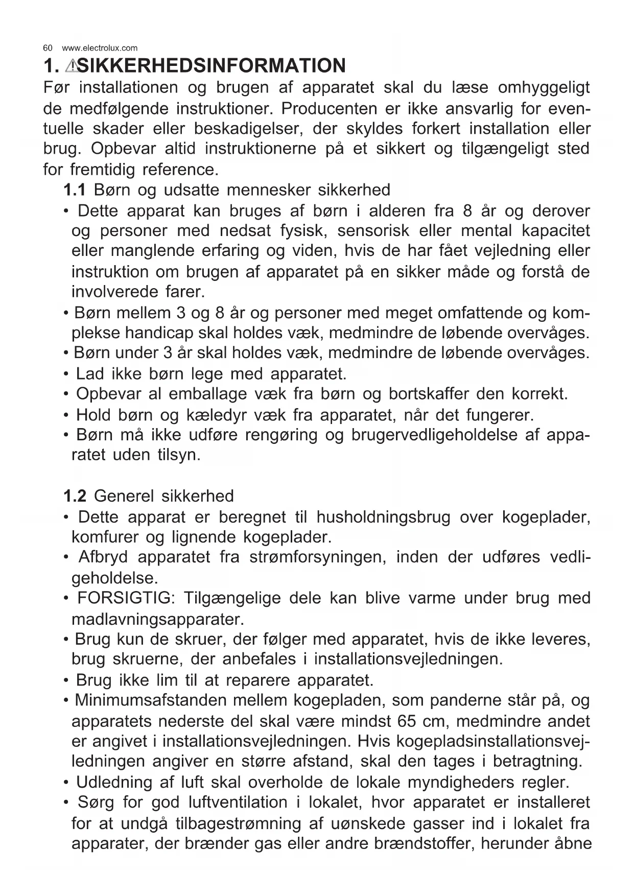 Vi anbefaler, at der kun anvendes originale reservedele. Sørg for at have følgende oplysninger parat, når du kontakter det autoriserede servicecenter: Model, Produktkode (PNC), Serienummer. Disse oplysninger fi ndes på typeskiltet. Advarsel / Forsigtig - Vigtige oplysninger vedrørende din sikkerhed Generelle oplysninger og tips Miljøhensyn Med forbehold for ændringer. DANSK60 www.electrolux.com