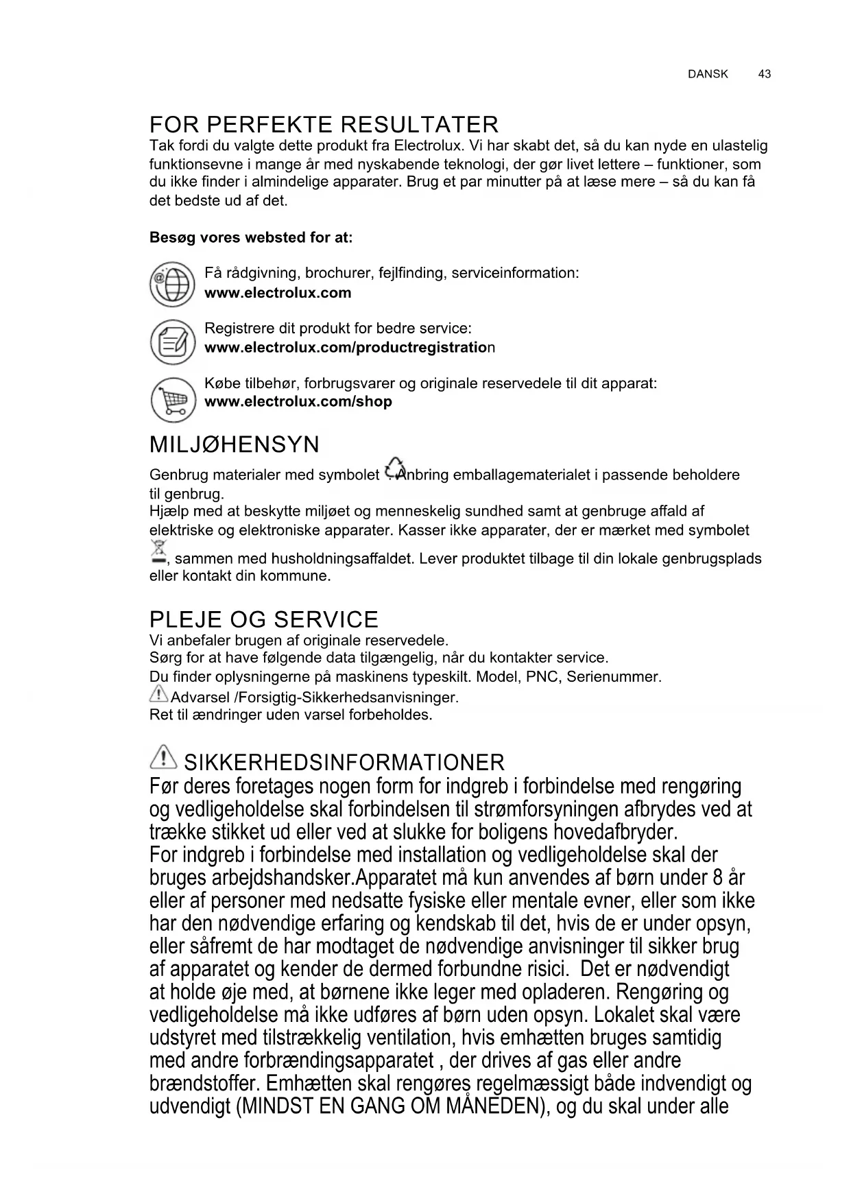 Tak fordi du valgte dette produkt fra Electrolux. Vi har skabt det, så du kan nyde en ulastelig funktionsevne i mange år med nyskabende teknologi, der gør livet lettere – funktioner, som du ikke nder i almindelige apparater. Brug et par minutter på at læse mere – så du kan få det bedste ud af det Besøg vores websted for at: Få rådgivning, brochurer, fejlnding, serviceinformation: www.electrolux.com Registrere dit produkt for bedre service: www.electrolux.com/productregistration Købe tilbehør, forbrugsvarer og originale reservedele til dit apparat: www.electrolux.com/shop MILJØHENSYN Genbrug materialer med symbolet Anbring emballagematerialet i passende beholdere til genbrug Hjælp med at beskytte miljøet og menneskelig sundhed samt at genbruge aald af elektriske og elektroniske apparater. Kasser ikke apparater, der er mærket med symbolet , sammen med husholdningsaaldet. Lever produktet tilbage til din lokale genbrugsplads eller kontakt din kommune