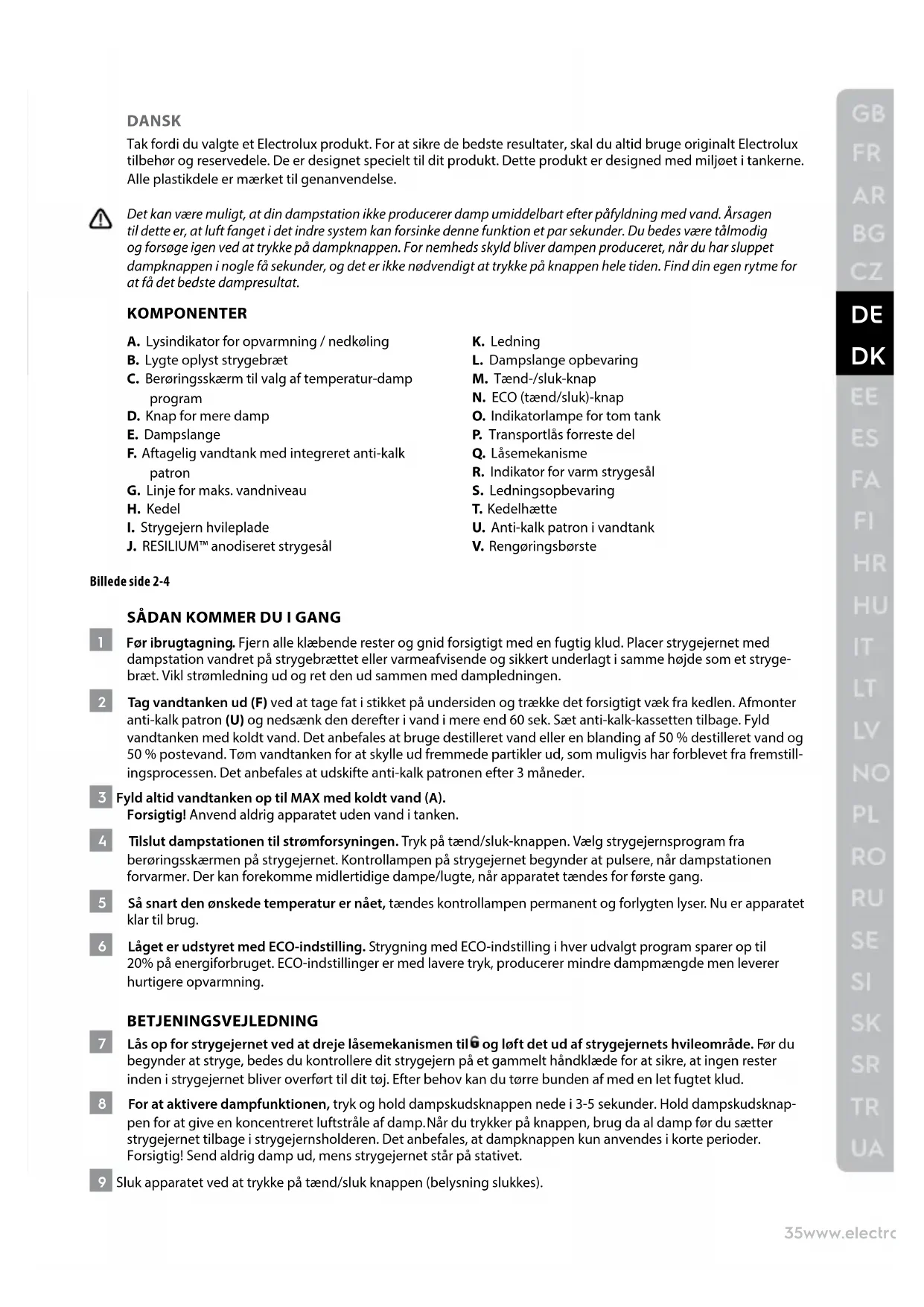 1 Før ibrugtagning. Fjern alle klæbende rester og gnid forsigtigt med en fugtig klud. Placer strygejernet med dampstation vandret på strygebrættet eller varmeafvisende og sikkert underlagt i samme højde som et stryge- bræt. Vikl strømledning ud og ret den ud sammen med dampledningen. 2 Tag vandtanken ud (F) ved at tage fat i stikket på undersiden og trække det forsigtigt væk fra kedlen. Afmonter anti-kalk patron (U) og nedsænk den derefter i vand i mere end 60 sek. Sæt anti-kalk-kassetten tilbage. Fyld vandtanken med koldt vand. Det anbefales at bruge destilleret vand eller en blanding af 50 % destilleret vand og 50 % postevand. Tøm vandtanken for at skylle ud fremmede partikler ud, som muligvis har forblevet fra fremstill- ingsprocessen. Det anbefales at udskifte anti-kalk patronen efter 3 måneder. 3 Fyld altid vandtanken op til MAX med koldt vand (A). Forsigtig! Anvend aldrig apparatet uden vand i tanken. 4 Tilslut dampstationen til strømforsyningen. Tryk på tænd/sluk-knappen. Vælg strygejernsprogram fra berøringsskærmen på strygejernet. Kontrollampen på strygejernet begynder at pulsere, når dampstationen forvarmer. Der kan forekomme midlertidige dampe/lugte, når apparatet tændes for første gang. 5 Så snart den ønskede temperatur er nået, tændes kontrollampen permanent og forlygten lyser. Nu er apparatet klar til brug. 6 Låget er udstyret med ECO-indstilling. Strygning med ECO-indstilling i hver udvalgt program sparer op til 20% på energiforbruget. ECO-indstillinger er med lavere tryk, producerer mindre dampmængde men leverer hurtigere opvarmning. BETJENINGSVEJLEDNING 7 Lås op for strygejernet ved at dreje låsemekanismen til og løft det ud af strygejernets hvileområde. Før du begynder at stryge, bedes du kontrollere dit strygejern på et gammelt håndklæde for at sikre, at ingen rester inden i strygejernet bliver overført til dit tøj. Efter behov kan du tørre bunden af med en let fugtet klud. 8 For at aktivere dampfunktionen, tryk og hold dampskudsknappen nede i 3-5 sekunder. Hold dampskudsknap- pen for at give en koncentreret luftstråle af damp. Når du trykker på knappen, brug da al damp før du sætter strygejernet tilbage i strygejernsholderen. Det anbefales, at dampknappen kun anvendes i korte perioder. Forsigtig! Send aldrig damp ud, mens strygejernet står på stativet. 9 Sluk apparatet ved at trykke på tænd/sluk knappen (belysning slukkes).36 www.electrolux.com 10 Lad altid strygejernet afkøle helt på hvileområdet, inden det pakkes væk. Når strygejernet er koldt, tømmes vandtanken. Opbevar dampstation strygejernet på hvileområdet 11 Når du er færdig med at bruge apparatet, sluk for apparatet ved at trykke på tænd-/sluk -knappen Stil strygejer- net på hvileområdet og slå låsemekanismen til for at sikre strygejernet. 12 Opbevar altid ledningen i ledningsopbevaringen (S) og dampslangen i dampslangeopbevaring (L) på dampstationens base. Advarsel! Vikl ALDRIG strømledningen rundt om strygejernet. RENGØRING 13 Drej stationen til siden, så kedelhætten er øverst. Skru kedelhætten af Hold apparatets side over en vask og tøm varmtvandsbeholderen helt. 14 Klargør mindst 300 ml af afkalkningsblandingen. (Brug den anbefalede ratio for blandingen. Hvis der er meget kalk, øges andelen af afkalkningsmiddel.). OBS: Vi anbefaler at bruge afkalkningsmidlet EUD5 fra Electrolux. Følg instruktionerne til blandingsforholdet mellem vand/afkalkningsmiddel, der er angivet på asken. Vi anbefaler at rengøre produktet hver anden måned. 15 Hæld blandingen ud. Fyld kedlen med rent vand, og hæld det ud igen. Gentag dette trin ere gange, indtil kalken er ernet og der ikke længere er en lugt af afkalkningsmiddel. Påfyld én målekop rent vand i kedlen, inden den samles igen. GARANTIEN DÆKKER IKKE SKADER SOM FØLGE AF TILSTOPNING PÅ GRUND AF KALK. Tøm ikke brygenheden helt for vand efter rengøring, men lad lidt vand stå i den (inden den lukkes igen). 16 Indsæt rensebørsten i kedlens åbning og rens vand og kalkrester ud, mens apparatet over en vask. 17 Rengør maskinen med en lidt fugtig klud. For at erne stædige pletter kan du anvende en lille mængde ikke-slibende rengøringsmidler. Nyd dit nye Electrolux produkt! SIKKERHEDSRÅD Læs følgende vejledning omhyggeligt, før strygejernet anvendes første gang.