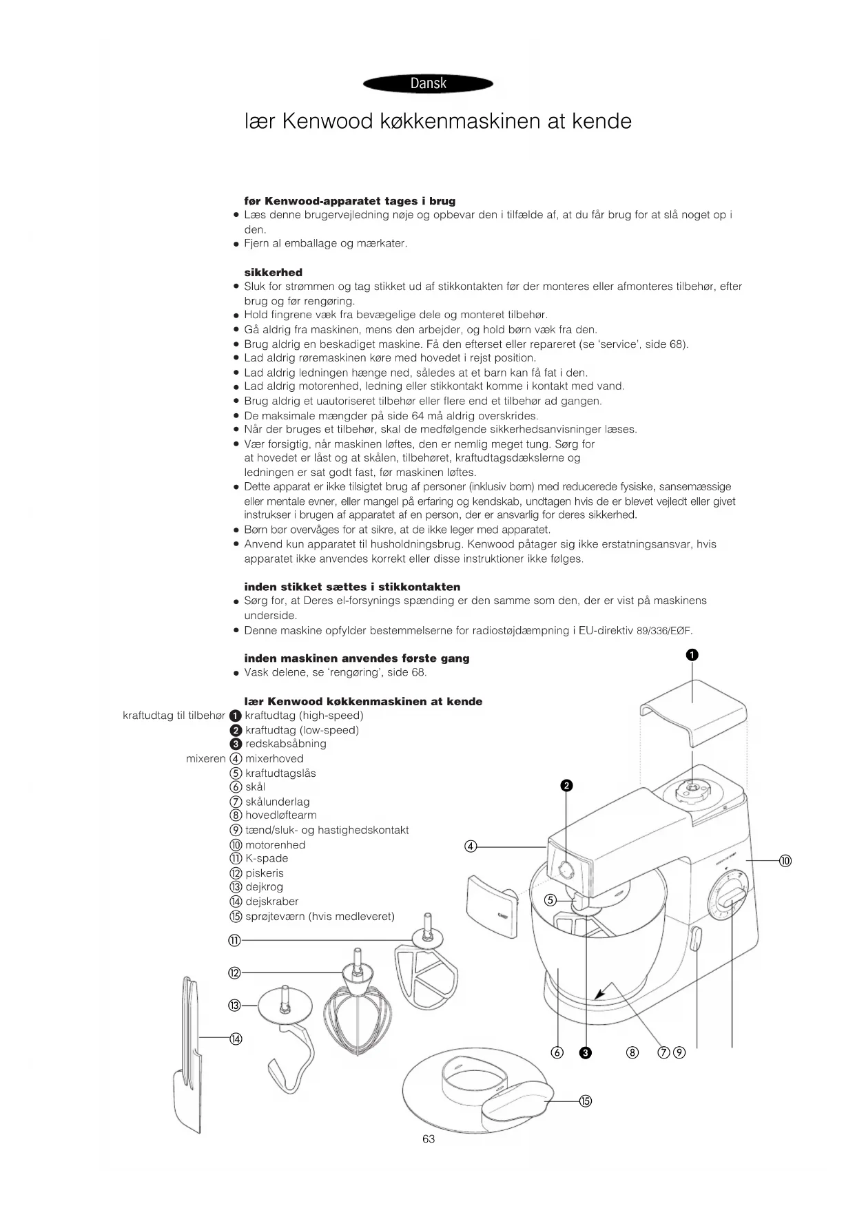 Vask delene, se ‘rengøring’, side 68. lær Kenwood køkkenmaskinen at kende kraftudtag til tilbehør kraftudtag (high-speed) kraftudtag (low-speed) redskabsåbning mixeren mixerhoved kraftudtagslås skål skålunderlag hovedløftearm tænd/sluk- og hastighedskontakt motorenhed K-spade piskeris dejkrog dejskraber sprøjteværn (hvis medleveret) lær Kenwood køkkenmaskinen at kende