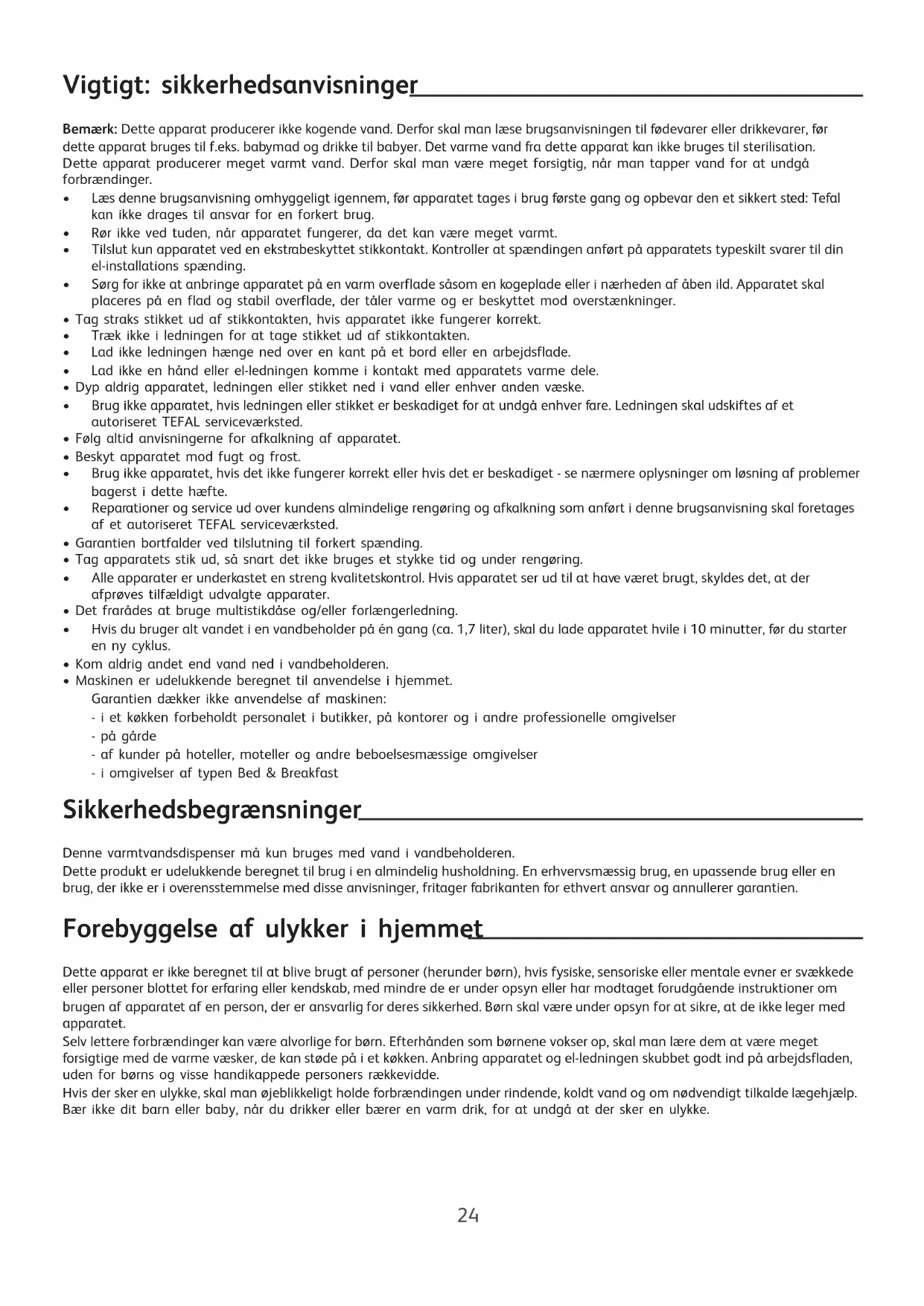 - Maskinen er udelukkende beregnet til anvendelse i hjemmet. Garantien dækker ikke anvendelse af maskinen: - i et køkken forbeholdt personalet i butikker, på kontorer og i andre professionelle omgivelser - på gårde - af kunder på hoteller, moteller og andre beboelsesmæssige omgivelser - i omgivelser af typen Bed & Breakfast Sikkerhedsbegrænsninger Denne varmtvandsdispenser må kun bruges med vand i vandbeholderen. Dette produkt er udelukkende beregnet til brug i en almindelig husholdning. En erhvervsmæssig brug, en upassende brug eller en brug, der ikke er i overensstemmelse med disse anvisninger, fritager fabrikanten for ethvert ansvar og annullerer garantien. Forebyggelse af ulykker i hjemmet Dette apparat er ikke beregnet til at blive brugt af personer (herunder børn), hvis fysiske, sensoriske eller mentale evner er svækkede eller personer blottet for erfaring eller kendskab, med mindre de er under opsyn eller har modtaget forudgående instruktioner om brugen af apparatet af en person, der er ansvarlig for deres sikkerhed. Børn skal være under opsyn for at sikre, at de ikke leger med apparatet. Selv lettere forbrændinger kan være alvorlige for børn. Efterhånden som børnene vokser op, skal man lære dem at være meget forsigtige med de varme væsker, de kan støde på i et køkken. Anbring apparatet og el-ledningen skubbet godt ind på arbejdsfladen, uden for børns og visse handikappede personers rækkevidde. Hvis der sker en ulykke, skal man øjeblikkeligt holde forbrændingen under rindende, koldt vand og om nødvendigt tilkalde lægehjælp. Bær ikke dit barn eller baby, når du drikker eller bærer en varm drik, for at undgå at der sker en ulykke.