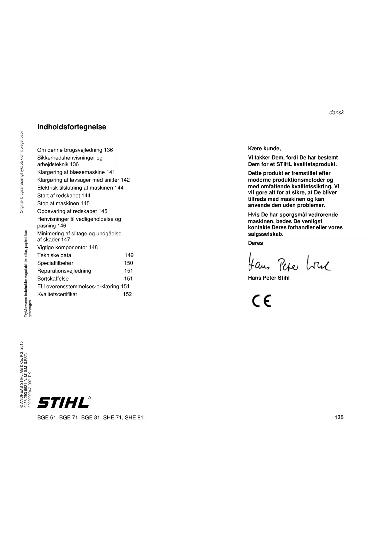 Indholdsfortegnelse Kære kunde, Vi takker Dem, fordi De har bestemt Dem for et STIHL kvalitetsprodukt. Dette produkt er fremstillet efter moderne produktionsmetoder og med omfattende kvalitetssikring. Vi vil gøre alt for at sikre, at De bliver tilfreds med maskinen og kan anvende den uden problemer. Hvis De har spørgsmål vedrørende maskinen, bedes De venligst kontakte Deres forhandler eller vores salgsselskab. Deres Hans Peter Stihl Om denne brugsvejledning 136 Sikkerhedshenvisninger og arbejdsteknik 136 Klargøring af blæsemaskine 141 Klargøring af løvsuger med snitter 142 Elektrisk tilslutning af maskinen 144 Start af redskabet 144 Stop af maskinen 145 Opbevaring af redskabet 145 Henvisninger til vedligeholdelse og pasning 146 Minimering af slitage og undgåelse af skader 147 Vigtige komponenter 148 Tekniske data 149 Specialtilbehør 150 Reparationsvejledning 151 Bortskaffelse 151 EU overensstemmelses-erklæring 151 Kvalitetscertifikat 152BGE 61, BGE 71, BGE 81, SHE 71, SHE 81 dansk