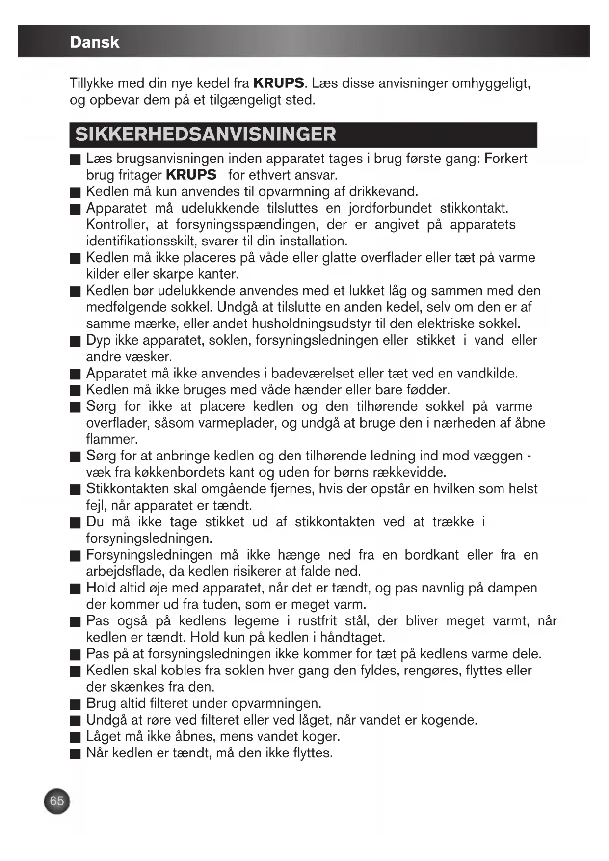 Når kedlen er tændt, må den ikke flyttes. Tillykke med din nye kedel fra KRUPS. Læs disse anvisninger omhyggeligt, og opbevar dem på et tilgængeligt sted. IFU_KR_KETTLES_PRECISION_NC00017283_Mise en page 1 01/06/10 14:21 Page65Dansk