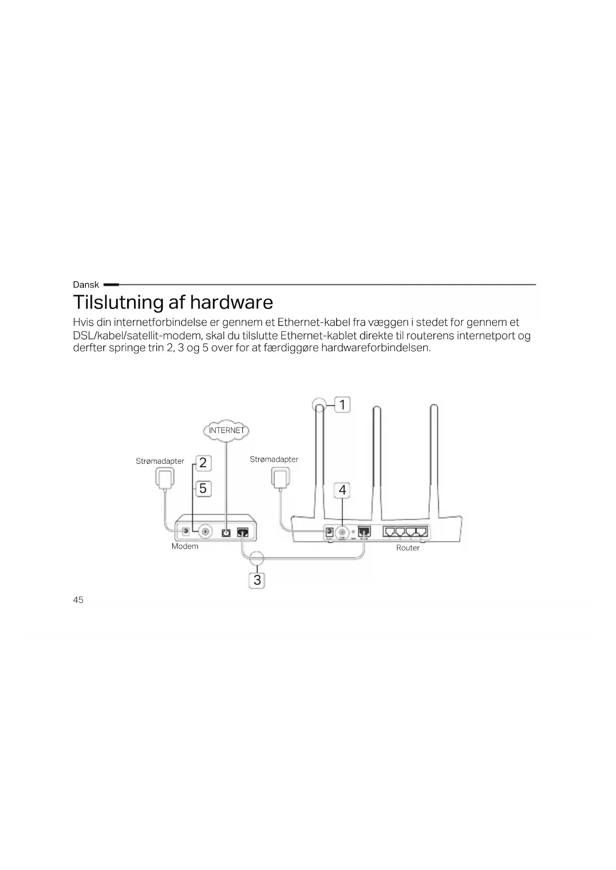 https://www.tp-link.com for å laste ned brukerveiledningen for ruteren.45 Dansk Tilslutning af hardware Hvis din internetforbindelse er gennem et Ethernet-kabel fra væggen i stedet for gennem et DSL/kabel/satellit-modem, skal du tilslutte Ethernet-kablet direkte til routerens internetport og derfter springe trin 2, 3 og 5 over for at færdiggøre hardwareforbindelsen.
