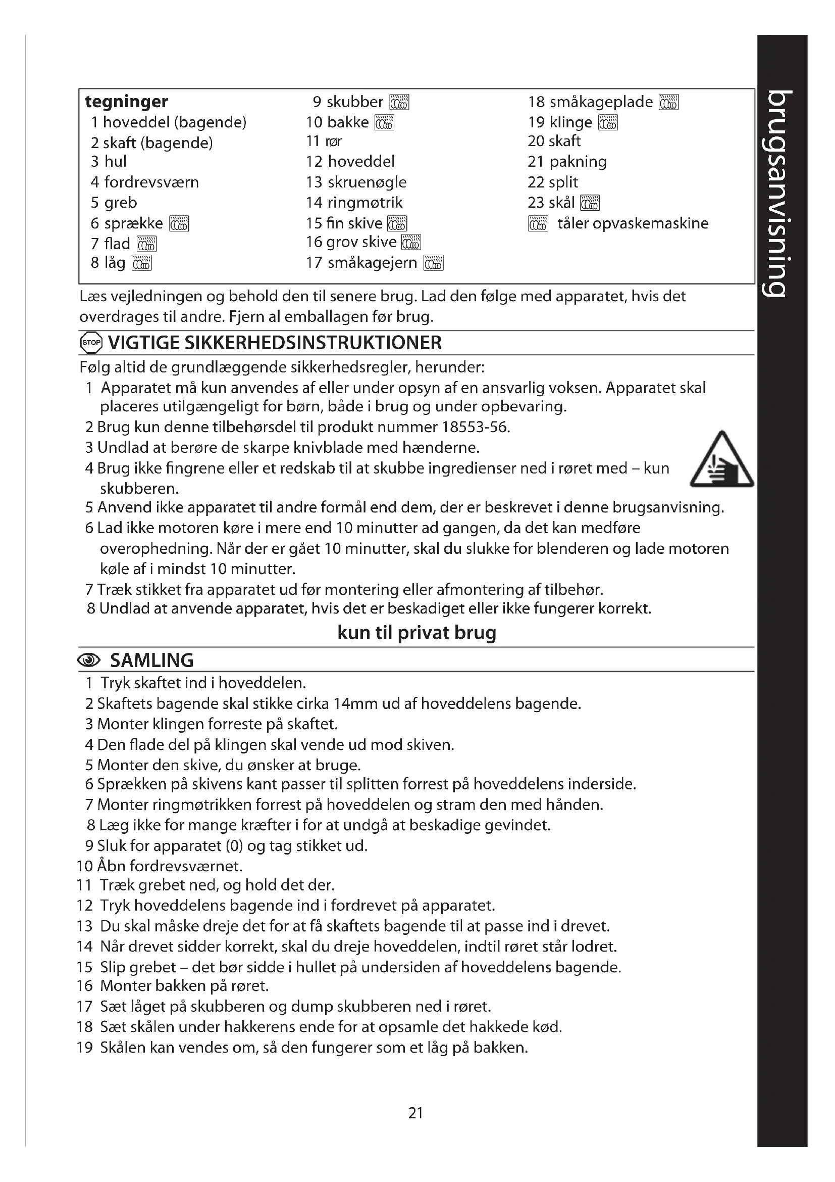 Følg altid de grundlæggende sikkerhedsregler, herunder: 1 Apparatet må kun anvendes af eller under opsyn af en ansvarlig voksen. Apparatet skal placeres utilgængeligt for børn, både i brug og under opbevaring. 2 Brug kun denne tilbehørsdel til produkt nummer 18553-56. 3 Undlad at berøre de skarpe knivblade med hænderne. 4 Brug ikke fingrene eller et redskab til at skubbe ingredienser ned i røret med – kun skubberen. 5 Anvend ikke apparatet til andre formål end dem, der er beskrevet i denne brugsanvisning. 6 Lad ikke motoren køre i mere end 10 minutter ad gangen, da det kan medføre overophedning. Når der er gået 10 minutter, skal du slukke for blenderen og lade motoren køle af i mindst 10 minutter. 7 Træk stikket fra apparatet ud før montering eller afmontering af tilbehør. 8 Undlad at anvende apparatet, hvis det er beskadiget eller ikke fungerer korrekt. kun til privat brug C SAMLING 1 Tryk skaftet ind i hoveddelen. 2 Skaftets bagende skal stikke cirka 14mm ud af hoveddelens bagende. 3 Monter klingen forreste på skaftet. 4 Den flade del på klingen skal vende ud mod skiven. 5 Monter den skive, du ønsker at bruge. 6 Sprækken på skivens kant passer til splitten forrest på hoveddelens inderside. 7 Monter ringmøtrikken forrest på hoveddelen og stram den med hånden. 8 Læg ikke for mange kræfter i for at undgå at beskadige gevindet. 9 Sluk for apparatet () og tag stikket ud. 10 Åbn fordrevsværnet. 11 Træk grebet ned, og hold det der. 12 Tryk hoveddelens bagende ind i fordrevet på apparatet. 13 Du skal måske dreje det for at få skaftets bagende til at passe ind i drevet. 14 Når drevet sidder korrekt, skal du dreje hoveddelen, indtil røret står lodret. 15 Slip grebet – det bør sidde i hullet på undersiden af hoveddelens bagende. 16 Monter bakken på røret. 17 Sæt låget på skubberen og dump skubberen ned i røret. 18 Sæt skålen under hakkerens ende for at opsamle det hakkede kød. 19 Skålen kan vendes om, så den fungerer som et låg på bakken. brugsanvisning tegninger 1 hoveddel (bagende) 2 skaft (bagende) 3 hul 4 fordrevsværn 5 greb 6 sprække ` 7 flad ` 8 låg ` 9 skubber ` 10 bakke ` 11 rør 12 hoveddel 13 skruenøgle 14 ringmøtrik 15 fin skive ` 16 grov skive ` 17 småkagejern ` 18 småkageplade ` 19 klinge ` 20 skaft 21 pakning 22 split 23 skål ` ` tåler opvaskemaskine22 C HAKNING 20 Skær kødet i tern på 25mm og læg dem på bakken. 21 Tilslut apparatet til strøm. 22 Vælg hastighed 4 eller derover. 23 Fjern skubberen og lad ingredienserne falde ned i røret. 24 Sæt skubberen tilbage og brug den til at skubbe ingredienserne forsigtigt ned i røret med. 25 Når du er færdig, kør nogle brødrester gennem hakkeren for at erne tilbageværende kød fra skiven. 26 Sluk for apparatet () og tag stikket ud. C HVILKEN SKIVE? 27 Brug den fine skive til hakning af fersk kød til hakkekød eller frikadeller, og til citrussrkæller. 28 Hvis du ønsker en ekstra fin hakning, til pølser eller paté, kør kødet igennem hakkeren igen. 29 Brug den grove skive til hakning af kød til burgere. 30 Hak alle andre fødevarer med den skive, som giver dig den ønskede størrelse.