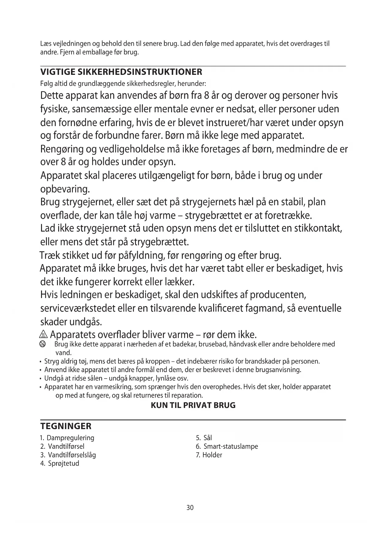 AE30 Læs vejledningen og behold den til senere brug. Lad den følge med apparatet, hvis det overdrages til andre. Fjern al emballage før brug. VIGTIGE SIKKERHEDSINSTRUKTIONER Følg altid de grundlæggende sikkerhedsregler, herunder: Dette apparat kan anvendes af børn fra 8 år og derover og personer hvis fysiske, sansemæssige eller mentale evner er nedsat, eller personer uden den fornødne erfaring, hvis de er blevet instrueret/har været under opsyn og forstår de forbundne farer. Børn må ikke lege med apparatet. Rengøring og vedligeholdelse må ikke foretages af børn, medmindre de er over 8 år og holdes under opsyn. Apparatet skal placeres utilgængeligt for børn, både i brug og under opbevaring. Brug strygejernet, eller sæt det på strygejernets hæl på en stabil, plan overade, der kan tåle høj varme – strygebrættet er at foretrække. Lad ikke strygejernet stå uden opsyn mens det er tilsluttet en stikkontakt, eller mens det står på strygebrættet. Træk stikket ud før påfyldning, før rengøring og efter brug. Apparatet må ikke bruges, hvis det har været tabt eller er beskadiget, hvis det ikke fungerer korrekt eller lækker. Hvis ledningen er beskadiget, skal den udskiftes af producenten, serviceværkstedet eller en tilsvarende kvaliceret fagmand, så eventuelle skader undgås. h Apparatets overader bliver varme – rør dem ikke. b Brug ikke dette apparat i nærheden af et badekar, brusebad, håndvask eller andre beholdere med vand.