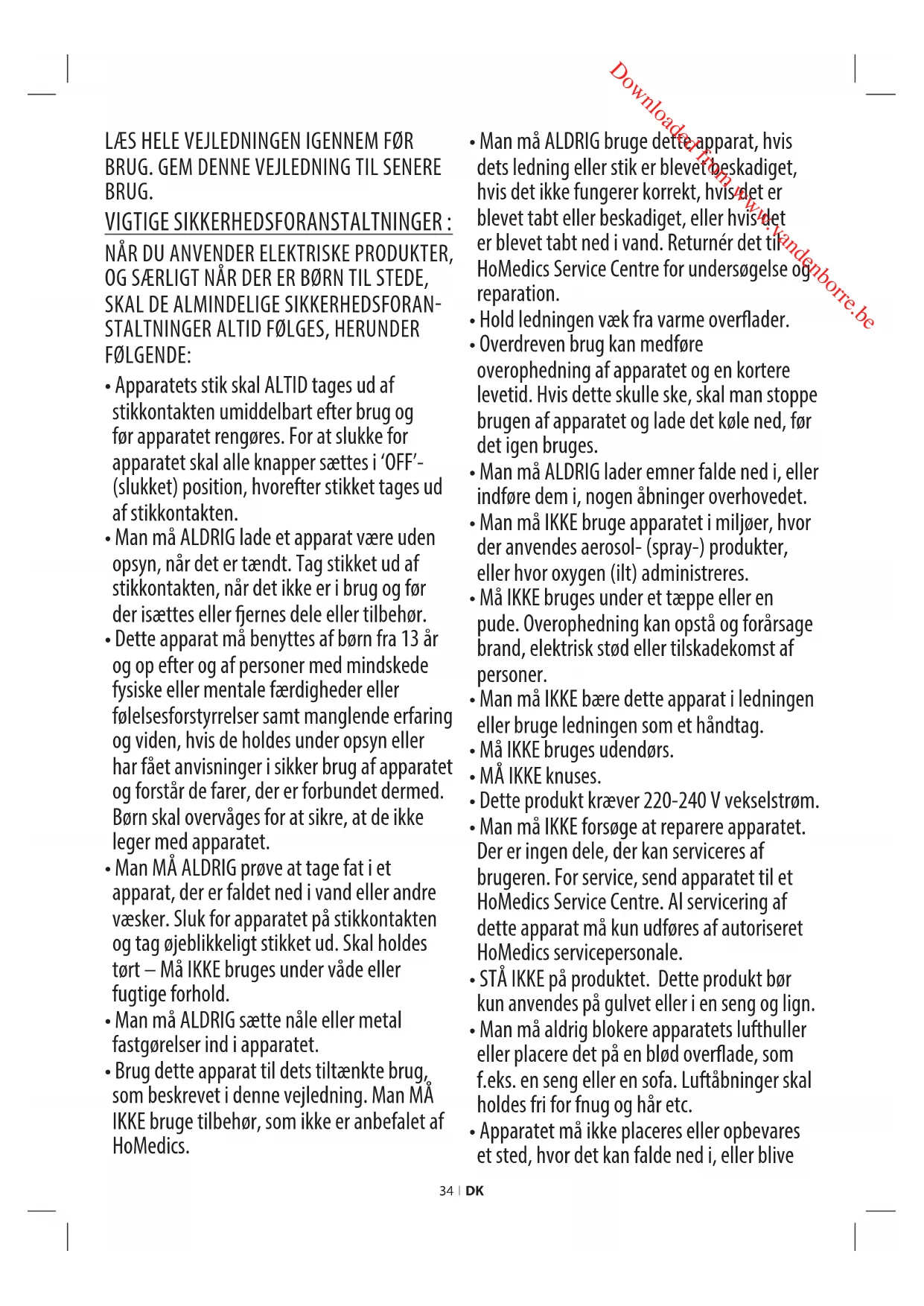 - Man må ALDRIG bruge dette apparat, hvis dets ledning eller stik er blevet beskadiget, hvis det ikke fungerer korrekt, hvis det er blevet tabt eller beskadiget, eller hvis det er blevet tabt ned i vand. Returnér det til HoMedics Service Centre for undersøgelse og reparation.