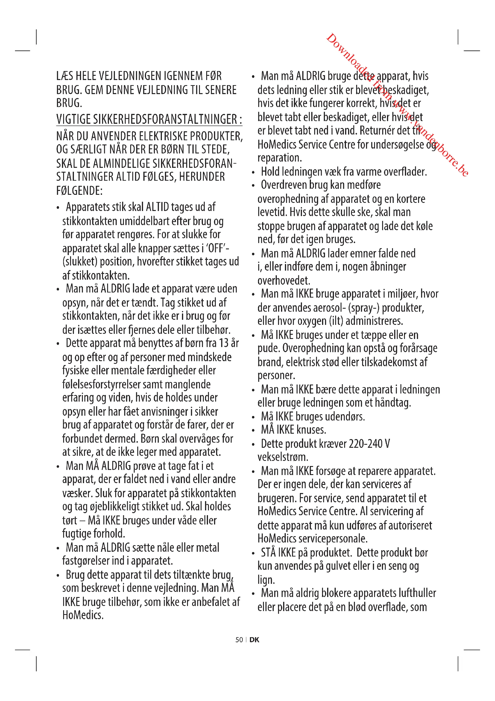 - Brug dette apparat til dets tiltænkte brug, som beskrevet i denne vejledning. Man MÅ IKKE bruge tilbehør, som ikke er anbefalet af HoMedics.