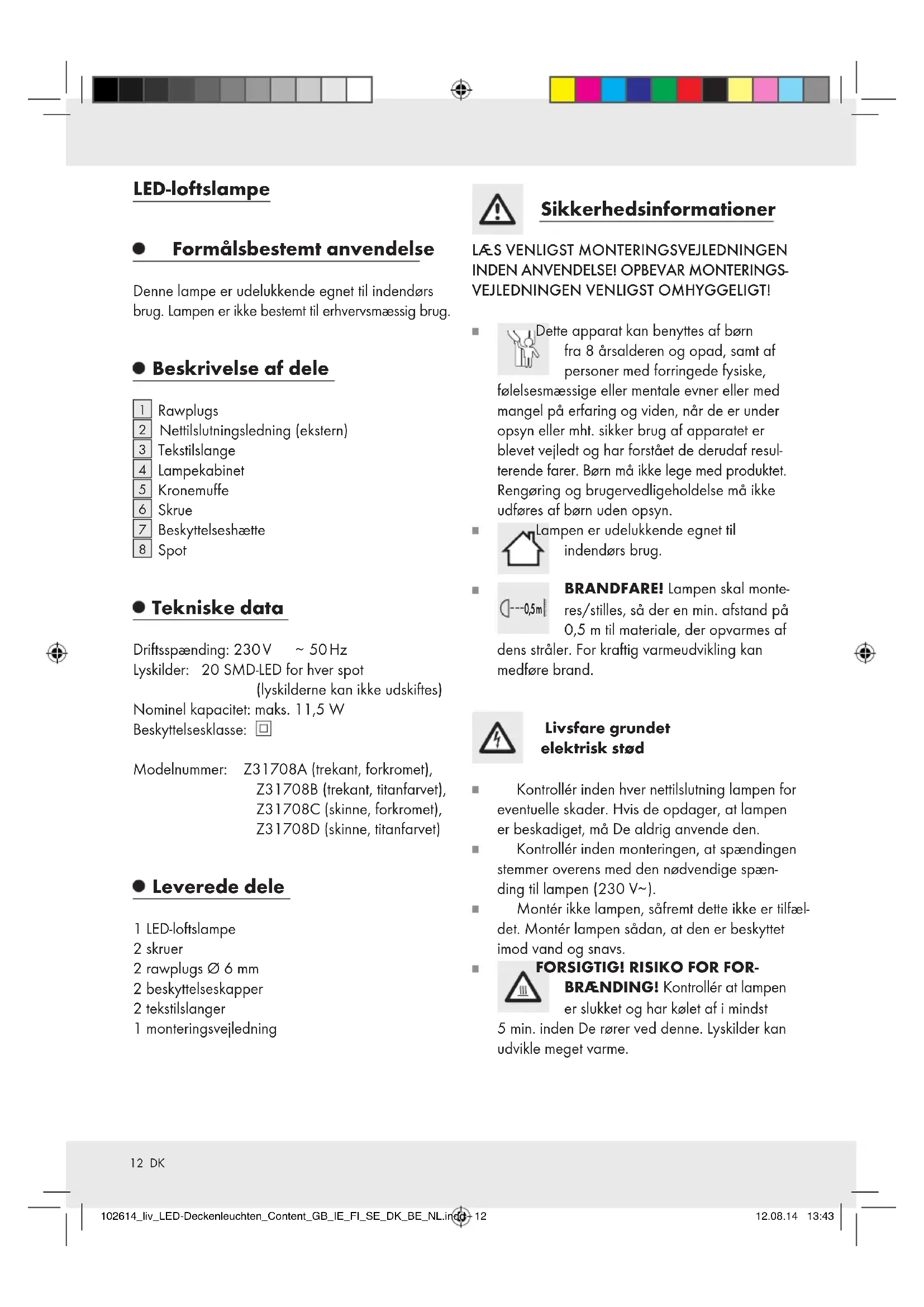 lader sig justere med ca. 90° vertikalt og med ca. 330° horisontalt, for målrettet at sætte lysaccenter (se afbildning E). ADVARSEL: Spottene bliver varme under driften. Sluk for disse og lad disse afkøle i 5 minutter, inden De rører ved dem. Rengøring og vedligeholdelse Inden De påbegynder rengøringen og plejen af Deres lampe afbryd først lampen fra nettet (sikring fjernes eller kontakten til ledningsbeskyttelse i sik- ringsskabet slukkes - 0-stilling) og lad denne afkøle i mindst 5 minutter! Af hensyn til den elektriske sikkerhed må lampen under ingen omstændigheder rengøres med vand eller andre væsker og aldrig dyppes i vand. Brug ingen opløsningsmidler, benzin eller lig- nende. Herved vil lampen kunne tage skade. Til rengøring må der kun anvendes en tør, fnug- fri klud. Bortskaffelse Indpakningen består af miljøvenlige materialer, der kan bortskaffes på de lokale genbrugssteder. Muligheder for bortskaffelse af det udtjente produkt kan De få oplyst hos de lokale myndigheder. Bortskaf apparatet / artiklen under ingen omstæn- digheder via den normale husholdningsaffald. 102614_liv_LED-Deckenleuchten_Content_GB_IE_FI_SE_DK_BE_NL.indd 13 12.08.14 13:4314 DK Bortskaf apparatet / artiklen via en godkendt bortskaffelsesvirksomhed eller via Deres kommunale affaldsordning. Overhold de gældende forskrifter. Kontakt genbrugspladsen, hvis De er i tvivl. Garanti Apparatet er produceret omhyggeligt efter strenge kvalitetskrav og inden levering afprøvet samvittig- hedsfuldt. Hvis der forekommer mangler ved dette produkt, har du juridiske rettigheder over for sælgeren af dette produkt. Disse juridiske rettigheder ind skræn- kes ikke af vores garanti, der beskrives i det følgende. Du får 3 års garanti fra købsdatoen på dette appar at. Garantifristen begynder med købsdatoen. Opbevar den originale kassebon på et sikkert sted. Denne kassebon behøves som dokumentation for købet. Hvis der inden for 3 år fra købsdatoen for dette produkt opstår en materiale- eller fabrikationsfejl, bliver produktet repareret eller erstattet – efter vores valg – af os uden omkostninger for dig. Garantien bortfalder, hvis apparatet bliver beskadiget eller ikke anvendes eller vedligeholdes korrekt. Garantien gælder for materiale- eller fabrikationsfejl. Denne garanti dækker ikke produktdele, som er uds