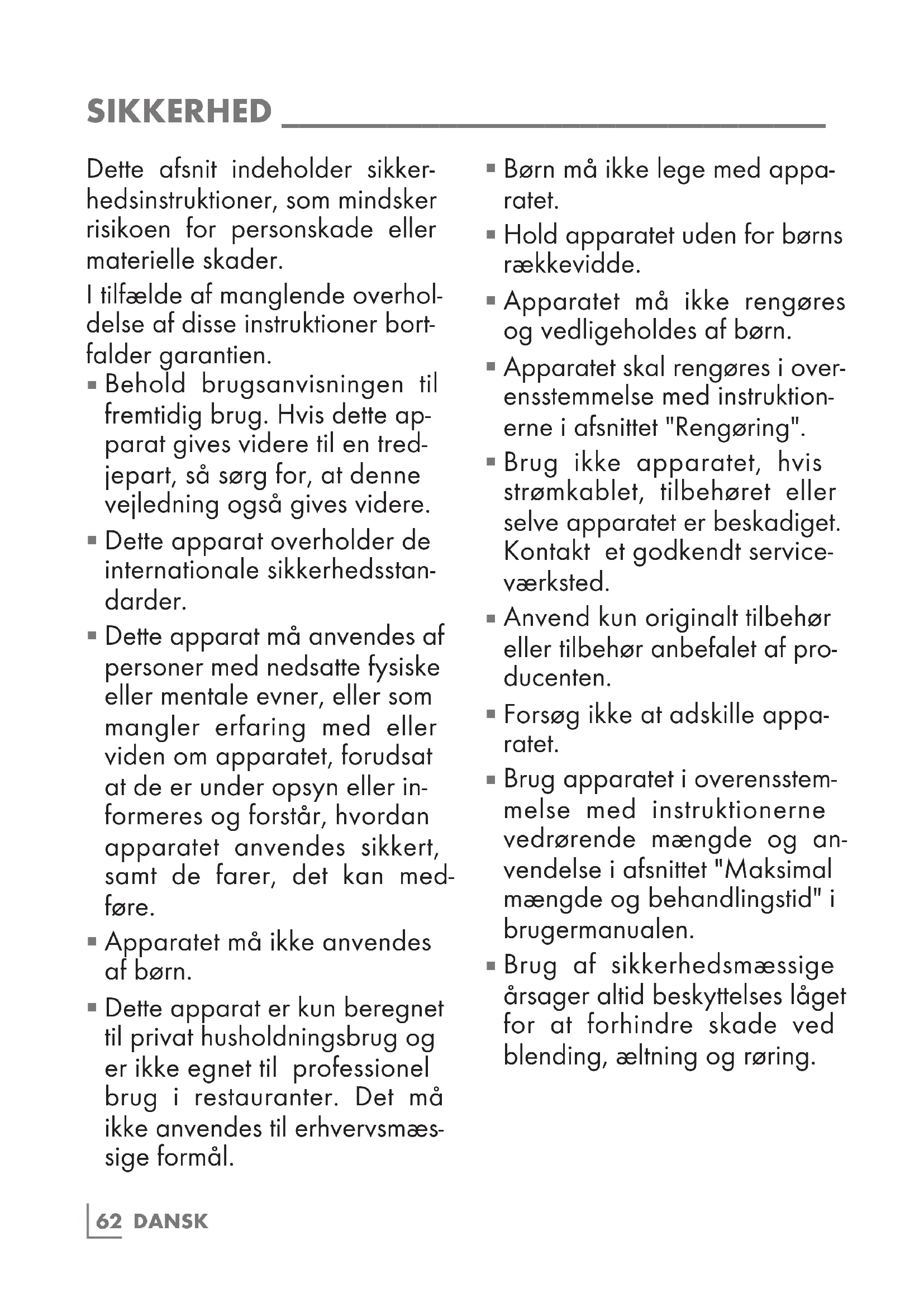 Brug af sikkerhedsmæssige årsager altid beskyttelses låget for at forhindre skade ved blending, æltning og røring. SIKKERHED _______________________________DANSK 63
