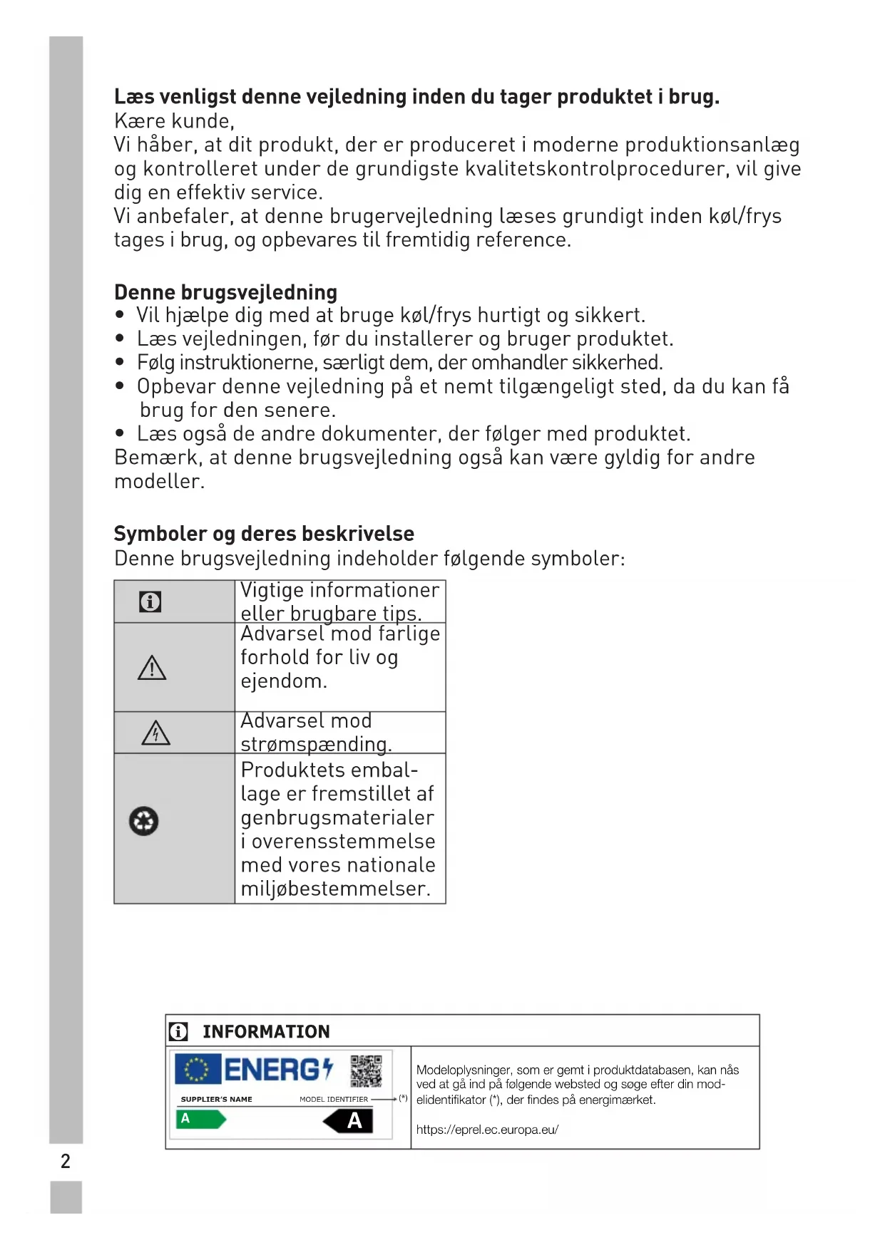 Læs venligst denne vejledning inden du tager produktet i brug. Kære kunde, Vi håber, at dit produkt, der er produceret i moderne produktionsanlæg og kontrolleret under de grundigste kvalitetskontrolprocedurer, vil give dig en effektiv service. Vi anbefaler, at denne brugervejledning læses grundigt inden køl/frys tages i brug, og opbevares til fremtidig reference. Denne brugsvejledning