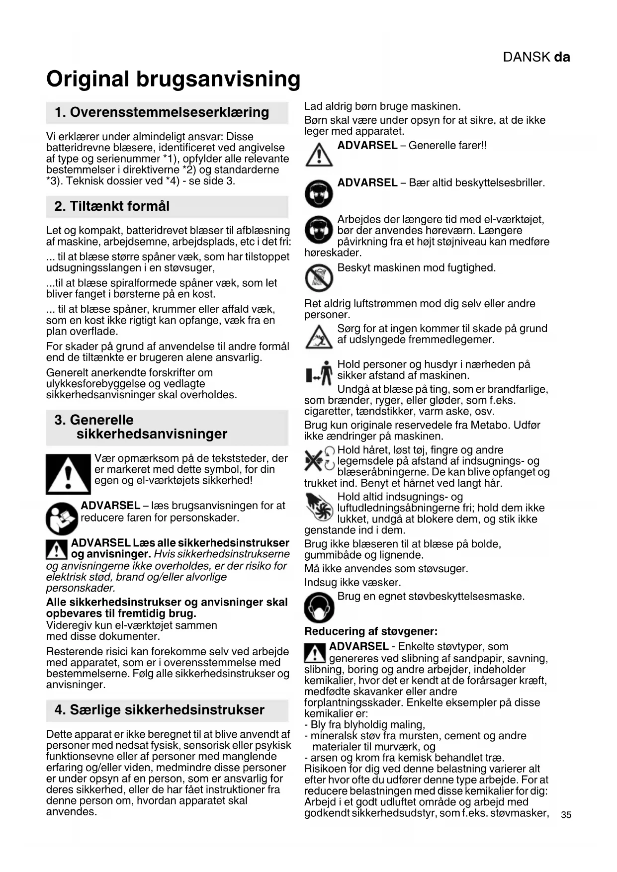 Original brugsanvisning Vi erklærer under almindeligt ansvar: Disse batteridrevne blæsere, identificeret ved angivelse af type og serienummer *1), opfylder alle relevante bestemmelser i direktiverne *2) og standarderne *3). Teknisk dossier ved *4) - se side 3. Let og kompakt, batteridrevet blæser til afblæsning af maskine, arbejdsemne, arbejdsplads, etc i det fri: ... til at blæse større spåner væk, som har tilstoppet udsugningsslangen i en støvsuger, ...til at blæse spiralformede spåner væk, som let bliver fanget i børsterne på en kost. ... til at blæse spåner, krummer eller affald væk, som en kost ikke rigtigt kan opfange, væk fra en plan overflade. For skader på grund af anvendelse til andre formål end de tiltænkte er brugeren alene ansvarlig. Generelt anerkendte forskrifter om ulykkesforebyggelse og vedlagte sikkerhedsanvisninger skal overholdes. Vær opmærksom på de tekststeder, der er markeret med dette symbol, for din egen og el-værktøjets sikkerhed! ADVARSEL – læs brugsanvisningen for at reducere faren for personskader. ADVARSEL Læs alle sikkerhedsinstrukser og anvisninger. Hvis sikkerhedsinstrukserne og anvisningerne ikke overholdes, er der risiko for elektrisk stød, brand og/eller alvorlige personskader. Alle sikkerhedsinstrukser og anvisninger skal opbevares til fremtidig brug. Videregiv kun el-værktøjet sammen med disse dokumenter. Resterende risici kan forekomme selv ved arbejde med apparatet, som er i overensstemmelse med bestemmelserne. Følg alle sikkerhedsinstrukser og anvisninger. Dette apparat er ikke beregnet til at blive anvendt af personer med nedsat fysisk, sensorisk eller psykisk funktionsevne eller af personer med manglende erfaring og/eller viden, medmindre disse personer er under opsyn af en person, som er ansvarlig for deres sikkerhed, eller de har fået instruktioner fra denne person om, hvordan apparatet skal anvendes. Lad aldrig børn bruge maskinen. Børn skal være under opsyn for at sikre, at de ikke leger med apparatet. ADVARSEL – Generelle farer!! ADVARSEL – Bær altid beskyttelsesbriller. Arbejdes der længere tid med el-værktøjet, bør der anvendes høreværn. Længere påvirkning fra et højt støjniveau kan medføre høreskader. Beskyt maskinen mod fugtighed. Ret aldrig luftstrømmen mod dig selv eller andre personer. Sørg for at ingen kommer til skade på grund af udslyngede fremmedlegemer. Hold personer og husdyr i nærheden på sikker afstand af maskinen. Undgå at blæse på ting, som er brandfarlige, som brænder, ryger, eller gløder, som f.eks. cigaretter, tændstikker, varm aske, osv. Brug kun originale reservedele fra Metabo. Udfør ikke ændringer på maskinen. Hold håret, løst tøj, fingre og andre legemsdele på afstand af indsugnings- og blæseråbningerne. De kan blive opfanget og trukket ind. Benyt et hårnet ved langt hår. Hold altid indsugnings- og luftudledningsåbningerne fri; hold dem ikke lukket, undgå at blokere dem, og stik ikke genstande ind i dem. Brug ikke blæseren til at blæse på bolde, gummibåde og lignende. Må ikke anvendes som støvsuger. Indsug ikke væsker. Brug en egnet støvbeskyttelsesmaske. Reducering af støvgener: ADVARSEL - Enkelte støvtyper, som genereres ved slibning af sandpapir, savning, slibning, boring og andre arbejder, indeholder kemikalier, hvor det er kendt at de forårsager kræft, medfødte skavanker eller andre forplantningsskader. Enkelte eksempler på disse kemikalier er: - Bly fra blyholdig maling, - mineralsk støv fra mursten, cement og andre materialer til murværk, og - arsen og krom fra kemisk behandlet træ. Risikoen for dig ved denne belastning varierer alt efter hvor ofte du udfører denne type arbejde. For at reducere belastningen med disse kemikalier for dig: Arbejd i et godt udluftet område og arbejd med godkendt sikkerhedsudstyr, som f.eks. støvmasker,