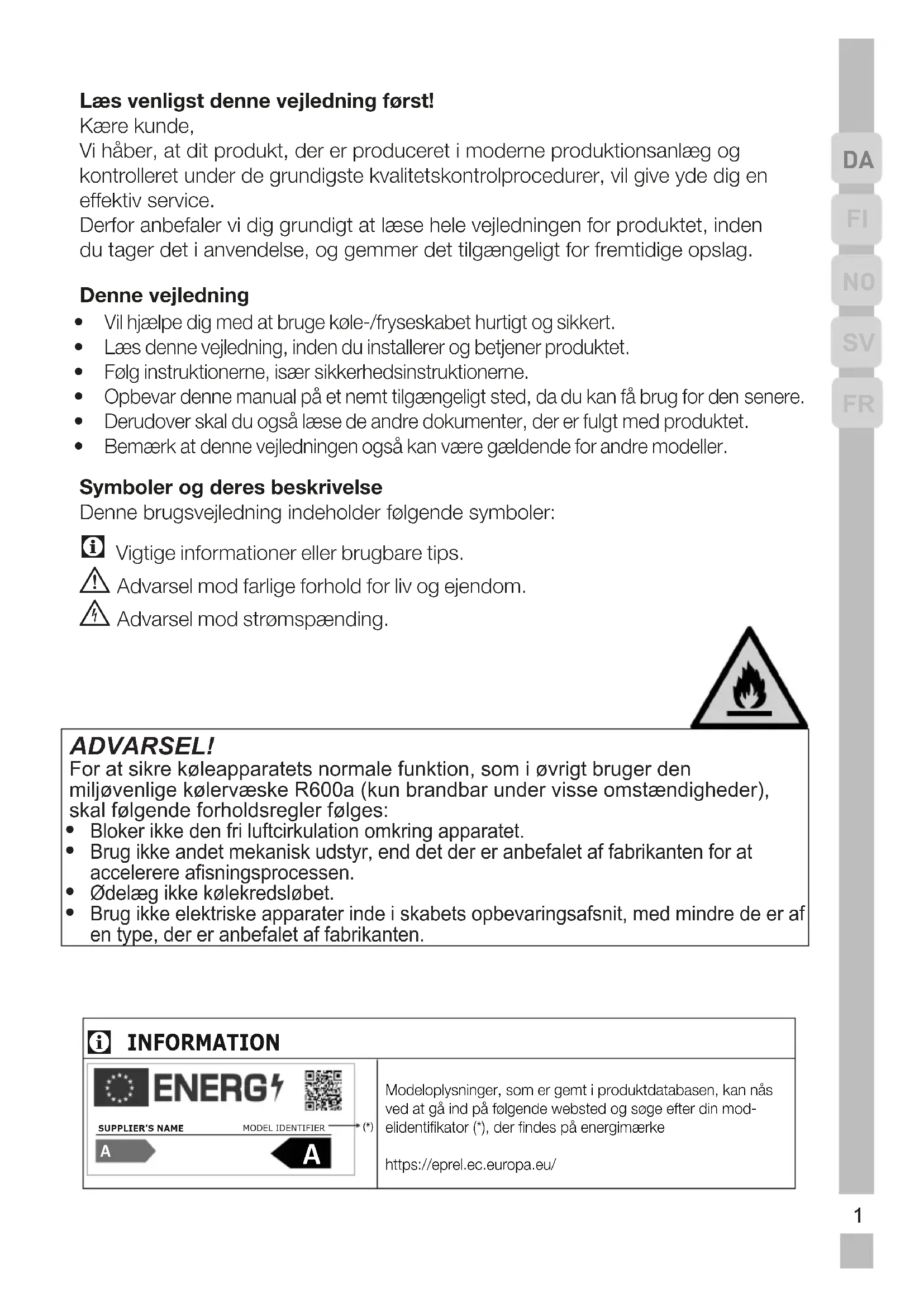 Bemærk at denne vejledningen også kan være gældende for andre modeller. Symboler og deres beskrivelseDenne brugsvejledning indeholder følgende symboler: C Vigtige informationer eller brugbare tips. A Advarsel mod farlige forhold for liv og ejendom. B Advarsel mod strømspænding. ADVARSEL! For at sikre køleapparatets normale funktion, som i øvrigt bruger den miljøvenlige kølervæske R600a (kun brandbar under visse omstændigheder), skal følgende forholdsregler følges: