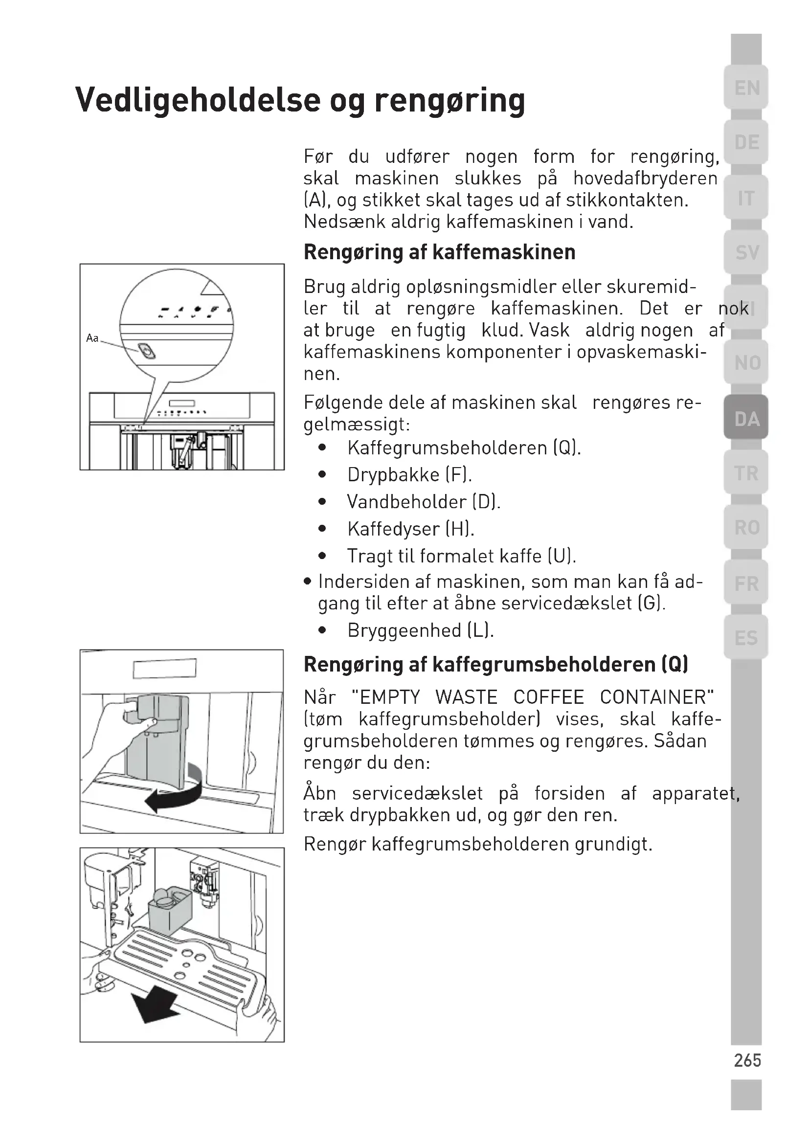 - Bryggeenhed(L). Rengøring af kaffegrumsbeholderen (Q) Når "EMPTY WASTE COFFEE CONTAINER" (tøm kaffegrumsbeholder) vises, skal kaffe- grumsbeholderentømmesogrengøres.Sådan rengørduden: Åbn servicedækslet på forsiden af apparatet, trækdrypbakkenud,oggørdenren. Rengørkaffegrumsbeholderengrundigt. Vedligeholdelse og rengøring Aa266 Vigtigt! Når du trækker drypbakken ud, skal kaffegrumsbeholderenaltidtømmes. Rengøring af drypbakken (F) Vigtigt! Hvis drypbakken ikke tømmes, kan vandetflydeover.Dettekanskademaskinen. Drypbakkenharenniveauindikator(rød),som viser vandniveauet indeni. Drypbakken skal tømmes,førindikatorenstikkerudfrakopbak- ken, ogdenskalrengøres. Sådan fjerner du drypbakken (F): 1.Åbnservicedækslet. 2.Fjerndrypbakkenogkaffegrumsbeholderen. 3.Rengør drypbakken og kaffegrumsbeholderen. 4.Sæt drypbakken og kaffegrumsbeholderen påpladsigen. 5.Lukservicedækslet. Rengøring af vandbeholderen (D) 1.Rengør vandbeholderen regelmæssigt (ca. engangommåneden)medenfugtigkludog lidtopvaskemiddel. 2.Fjernalleresterafopvaskemidlet. Rengøring af dyserne 1.Rengør dyserne regelmæssigt med en svamp. 2.Kontrollér regelmæssigt, at hullerne i kaffedysenikkeerblokeret. Vedligeholdelse og rengøring N267