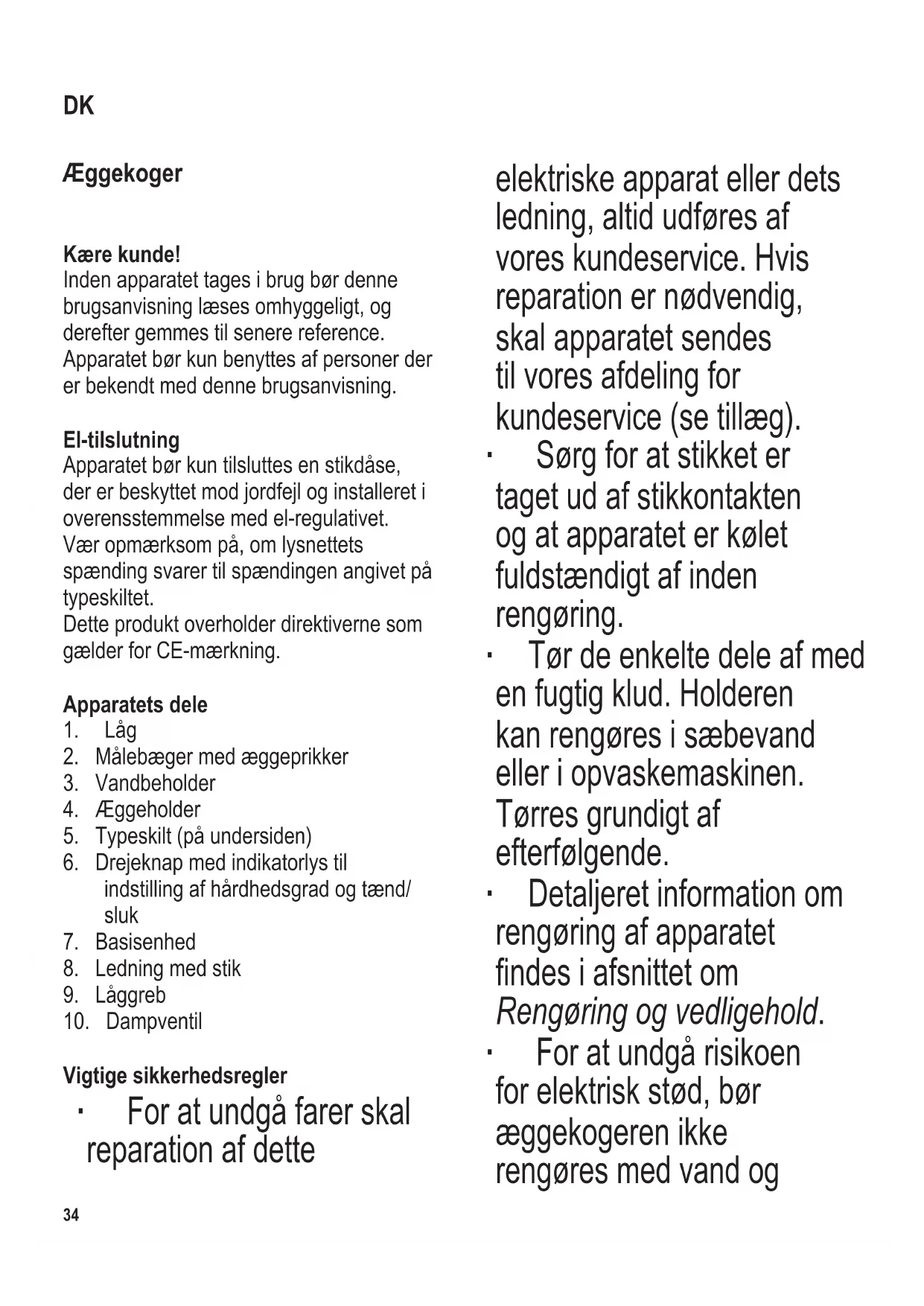 heller aldrig nedsænkes i vand. ∙ Dette apparat er beregnet til privat brug eller i tilsvarende omgivelser, såsom - i tekøkkener, kontorer eller andre mindre virksomheder, - landbrugsvirksomheder, - af kunder på hoteller, moteller m.m. og tilsvarende foretagender, - B&B pensionater. ∙ Pas på! Når æggeprikkeren benyttes. ∙ Advarsel! Æggekogerens overade og vandbeholder bliver meget varm når den er i brug og vil være det i nogen tid bagefter. Tag derfor altid kun fat i håndtaget når æggekogeren er varm. ∙ Advarsel! Varm damp kan slippe ud ved låget. ∙ Advarsel! Det kan medføre skader, hvis apparatet anvendes forkert. ∙ Apparatet kan benyttes af børn på mindst 8 år og af personer med reducerede fysiske, sensoriske eller mentale evner eller manglende erfaring og/ eller viden, såfremt de er under opsyn eller er blevet sat ind i, hvordan apparatet anvendes sikkert, og har forstået de farer, der er forbundet med anvendelsen. ∙ Børn må aldrig få lov til at lege med apparatet. ∙ Børn må aldrig få lov til at udføre rengørings- eller vedligeholdelsesarbejde på dette apparat, medmindre de er under opsyn og mindst 8 år gamle. ∙ Apparatet og dets ledning må altid holdes væk fra36 104 x 142 mm børn som er yngre en 8 år. ∙ Advarsel: Hold børn væk fra emballeringen, da denne udgør en mulig risiko for tilskadekomst, ved f.eks. kvælning. ∙ Inden apparatet benyttes må både apparatet og dets tilbehør ses grundigt efter for fejl. Hvis apparatet for eksempel har været tabt på en hård overade eller der er blevet trukket i ledningen med stor kraft, må det ikke længere benyttes: Selv skader der ikke er synlige kan have ugunstig indvirkning på sikkerheden ved brug af apparatet. I sådanne tilfælde, kontakt vores kundeservice. ∙ Efterlad ikke tilsluttede apparater uden opsyn. ∙ Ledningen må aldrig komme i berøring med varme genstande, kogeplader og lign. Ledningen må først vikles op om apparatet, når det er afkølet. ∙ Tag altid stikket ud af stikkontakten - i tilfælde af fejlfunktion, - efter brug, - inden rengøring af apparatet. ∙ Træk aldrig i selve ledningen, når ledningen tages ud af stikkontakten; tag altid fat i selve stikket. ∙ Under brug må apparatet placeres på en plan overade, der er vand- og varmefast. ∙ Placer aldrig apparatet på eller nær varme overader eller åben ild, såsom kogeplader eller gasblus. Brug ikke apparatet under sarte genstande eller møbler som f.eks. overskabe, da der kommer varm damp ud fra låget under brugen. ∙ Vi påtager os intet ansvar for skader, der skyldes misbrug eller manglende overholdelse af denne brugsanvisning. Før brug ∙ Pak apparatet ud, og fjern al emballage og eventuelle reklamemærkater fra apparatet. Typeskiltet må ikke fjernes. ∙ Brug apparatet en enkelt gang med æggeholder, men uden æg, med indstillingen /smilende, som beskrevet under ‘Betjening’. Betjening ∙ Fyld målebægeret helt op med koldt vand og hæld den opmålte mængde vand i vandbeholderen. ∙ Prik æggenes ade ende med æggeprikkeren; dette vil mindske risikoen for at æggene sprækker under kogningen. ∙ Placer æggene i holderen, sæt holderen ovenpå vandbeholderen og læg låget på. ∙ Sæt stikket i en stikkontakt. ∙ Indstil den ønskede hårdhedsgrad med drejeknappen: – blødkogt – smilende – hårdkogt ∙ Markeringerne gælder for køleskabskolde æg i størrelse M. ∙ Der kan foretages en individuel trinløs indstilling alt efter antallet af æg og deres størrelse: For mindre æg og æg med stuetemperatur drejes knappen lidt længere mod venstre.104 x 142 mm