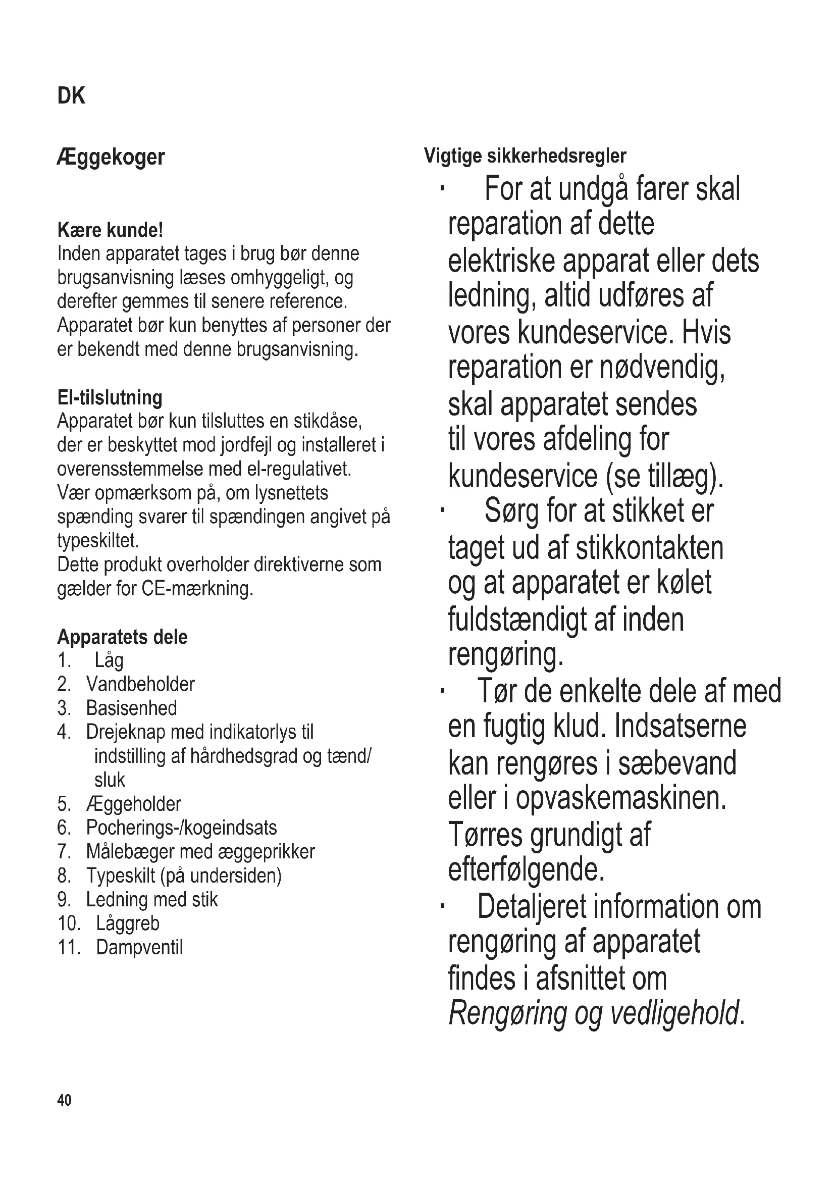 ∙ For at undgå risikoen for elektrisk stød, bør æggekogeren ikke rengøres med vand og heller aldrig nedsænkes i vand. ∙ Dette apparat er beregnet til privat brug eller i tilsvarende omgivelser, såsom - i tekøkkener, kontorer eller andre mindre virksomheder, - landbrugsvirksomheder, - af kunder på hoteller, moteller m.m. og tilsvarende foretagender, - B&B pensionater. ∙ Pas på! Når æggeprikkeren benyttes. ∙ Advarsel! Æggekogerens overade og vandbeholder bliver meget varm når den er i brug og vil være det i nogen tid bagefter. Tag derfor altid kun fat i håndtaget når æggekogeren er varm. ∙ Advarsel! Varm damp kan slippe ud ved låget. ∙ Advarsel! Det kan medføre skader, hvis apparatet anvendes forkert. ∙ Apparatet kan benyttes af børn på mindst 8 år og af personer med reducerede fysiske, sensoriske eller mentale evner eller manglende erfaring og/ eller viden, såfremt de er under opsyn eller er blevet sat ind i, hvordan apparatet anvendes sikkert, og har forstået de farer, der er forbundet med anvendelsen. ∙ Børn må aldrig få lov til at lege med apparatet. ∙ Børn må aldrig få lov til at udføre rengørings- eller vedligeholdelsesarbejde på dette apparat, medmindre42 104 x 142 mm de er under opsyn og mindst 8 år gamle. ∙ Apparatet og dets ledning må altid holdes væk fra børn som er yngre en 8 år. ∙ Advarsel: Hold børn væk fra emballeringen, da denne udgør en mulig risiko for tilskadekomst, ved f.eks. kvælning. ∙ Inden apparatet benyttes må både apparatet og dets tilbehør ses grundigt efter for fejl. Hvis apparatet for eksempel har været tabt på en hård overade eller der er blevet trukket i ledningen med stor kraft, må det ikke længere benyttes: Selv skader der ikke er synlige kan have ugunstig indvirkning på sikkerheden ved brug af apparatet. I sådanne tilfælde, kontakt vores kundeservice. ∙ Efterlad ikke tilsluttede apparater uden opsyn. ∙ Ledningen må aldrig komme i berøring med varme genstande, kogeplader og lign. Ledningen må først vikles op om apparatet, når det er afkølet. ∙ Tag altid stikket ud af stikkontakten - i tilfælde af fejlfunktion, - efter brug, - inden rengøring af apparatet. ∙ Træk aldrig i selve ledningen, når ledningen tages ud af stikkontakten; tag altid fat i selve stikket. ∙ Under brug må apparatet placeres på en plan overade, der er vand- og varmefast. ∙ Placer aldrig apparatet på eller nær varme overader eller åben ild, såsom kogeplader eller gasblus. Brug ikke apparatet under sarte genstande eller møbler som f.eks. overskabe, da der kommer varm damp ud fra låget under brugen. ∙ Vi påtager os intet ansvar for skader, der skyldes misbrug eller manglende overholdelse af denne brugsanvisning. Før brug ∙ Pak apparatet ud, og fjern al emballage og eventuelle reklamemærkater fra apparatet. Typeskiltet må ikke fjernes. ∙ Brug apparatet en enkelt gang med æggeholder, men uden æg, med indstillingen /smilende, som beskrevet under ‘Betjening’. ∙ Rengør pocherings-/kogeindsatsen i sæbevand, og tør den af. Kogning af æg ∙ Fyld målebægeret helt op med koldt vand og hæld den opmålte mængde vand i vandbeholderen. ∙ Prik æggenes ade ende med æggeprikkeren; dette vil mindske risikoen for at æggene sprækker under kogningen. ∙ Placer æggene i holderen, sæt holderen ovenpå vandbeholderen og læg låget på. ∙ Sæt stikket i en stikkontakt. ∙ Indstil den ønskede hårdhedsgrad med drejeknappen: – blødkogt – smilende – hårdkogt104 x 142 mm