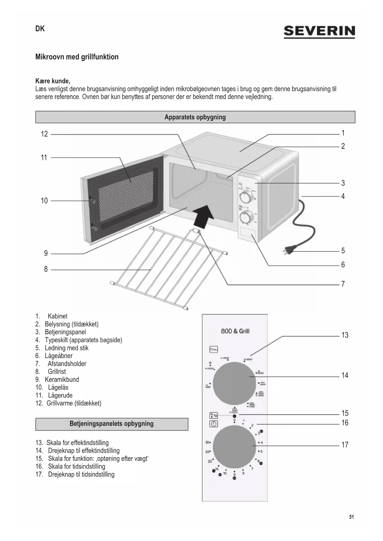Advarsel: Apparatets ydre ader kan blive varme under brug. Der er også fare for at damp kan udledes gennem ventilationsrillerne: Fare for skoldning. ∙ Lad først apparatet køle tilstrækkeligt af, inden det transporteres. ∙ Lad ikke apparatet eller dets ledning komme i berøring med varme overader eller komme i kontakt med andre varmekilder. ∙ Lad ikke ledningen hænge løst og hold den væk fra alle varme dele. ∙ Hvis apparatet ikke holdes ordentligt rent, kan det forårsage forringelse af overadernes kvalitet, hvilket kan medføre mulig forkortelse af apparatets levetid, såvel som mulig risiko for brugerens sikkerhed. Lågens tætninger, tilberedningsrummet med keramikbund og de tilstødende dele rengøres med en fugtig klud efter hver brug. Detaljeret information om rengøring af apparatet ndes i afsnittet om Rengøring. ∙ Apparatet må ikke rengøres med en damprenser. ∙ Dette apparat er beregnet til privat brug eller i tilsvarende omgivelser, såsom54 142 x 208 mm - i tekøkkener, kontorer eller andre mindre virksomheder, - landbrugsvirksomheder, - af kunder på hoteller, moteller m.m. og tilsvarende foretagender, - B&B pensionater. ∙ Advarsel! Al vedligehold eller reparation som nødvendiggør aftagning af strålebeskyttelsesdækslet udgør en alvorlig fare for uautoriserede personer. Dette gælder også udskiftning af den specielle ledning eller det indvendige lys. Apparatet bør aldrig åbnes af andre end kvalicerede reparatører. Hvis reparation er nødvendig, så send venligst mikrobølgeovnen til en af vore afdelinger for kundeservice. Adresserne kan ndes i tillægget til denne brugsanvisning. ∙ Ved opvarmning af væske i mikrobølgeovnen, kan væsken opvarmes til kogepunktet uden synlige tegn på bobler. Det er derfor vigtigt at der udvises ekstrem forsigtighed når beholderen håndteres, dvs. når den tages ud af ovnen. Denne risiko for at væsken koger over, kan mindskes ved at anbringe en varmefast glasstang i beholderen under opvarmningen. ∙ Hele æg med skal eller hårdkogte æg må aldrig varmes i en mikrobølgeovn da de kan eksplodere selv efter at opvarmningsprocessen er afsluttet. ∙ Advarsel! Det er også farligt at varme væsker eller fødevarer i nogen form for faste hermetisk lukkede beholdere, da disse kan eksplodere. ∙ Indholdet i sutteasker eller glasbeholdere må rystes eller omrøres grundigt for at sikre at varmen er jævnt fordelt. For at undgå pinefuld og farlig skoldning, skal man altid afprøve temperaturen, inden man mader et barn. ∙ Når man varmer eller tilbereder mad, der er indeholdt eller indpakket i et brændbart materiale såsom plastik eller papir, er der altid en fare for at disse materialer antændes. Det er også muligt at maden vil tørre ud eller endda antænde, hvis der vælges for lang kogetid. Fedt eller olie er også brændbare stoffer. Det er derfor vigtigt at overvåge mikrobølgeovnen under betjeningen. Stærkt brændbare væsker såsom koncentreret alkohol må selvfølgelig ikke opvarmes i mikrobølgeovnen. ∙ Hvis det begynder at ryge under betjeningen, holdes døren lukket for at hæmme eller kvæle udvikling af ammer. Sluk øjeblikkeligt for mikrobølgeovnen og tag stikket ud af stikkontakten. ∙ Brug egnede grydelapper, når maden tages ud af tilberedningsrummet. Servicet bliver ikke kun varmt i grillfunktion, men også i mikroovnsfunktion, da den varme mad også opvarmer servicet. ∙ Stegetermometre (den slags der benyttes i almindelige ovne) er ikke egnede til brug i mikrobølgeovne.55 142 x 208 mm Før brug ∙ Efter udpakningen og inden tilslutning til lysnettet, bør mikrobølgeovnen og dens ledning altid efterses for skader. ∙ Advarsel! Se efter om døren (samt ovnvinduet, dørens forsegling og dørlukkerne) ikke er beskadigede eller bøjede og at døren lukker tæt til dørstolpen. Dette er vigtigt for at sikre at der ikke undslipper mikrobølgeenergi under betjeningen. Af samme grund må hele kabinettet og ovnens indre også regelmæssigt omhyggeligt efterses. Hvis mikrobølgeovnen bliver beskadiget, må den ikke benyttes førend den er blevet repareret af en autoriseret reparatør. ∙ Fjern al ud- og indvendig indpakning. Typeskiltet må ikke fjernes. Denne er fremstillet af materiale egnet til genanvendelse. ∙ Fjern ikke gummiduppen fra grillristen! Grillristen skal sættes i, således at den runde afstandsholder med gummiduppen vender mod ovnrummets bagside. ∙ Advarsel: Hold børn væk fra emballeringen, da denne udgør en mulig risiko for tilskadekomst, ved f.eks. kvælning. ∙ Fjern ikke gummipropperne fra grillristen! ∙ Inden apparatet benyttes første gang, eller hvis det ikke har været benyttet i en længere periode, må det rengøres grundigt som anvist i afsnittet om Rengøring. ∙ Vigtigt: Tænd aldrig for mikrobølgeovnen medmindre den mad der skal tilberedes eller varmes er blevet placeret inde i ovnen. Opstart af en tom mikrobølgeovn kan resultere i skader på apparatet. ∙ Lad apparatet varme op i grillfunktion (uden mikroovn!) i 10 minutter, første gang det tages i brug. I den forbindelse kan der opstå en let lugt, og sørg derfor for tilstrækkelig udluftning ved at åbne vinduer eller altandøre. Mikrobølgefunktionen (Gruppe II iht. EN 55011) Elektromagnetisk energi genereres inden i mikrobølgeovnen, hvilket får molekylerne i maden (især vandmolekyler) til at vibrere og dette bevirker at maden bliver varm. Fødevarer med højt vandindhold vil derfor varmes op hurtigere end relativt tør mad. Varmen udvikles gradvist inden i maden. Det benyttede tilbehør, beholdere eller plader opvarmes kun indirekte som følge af madens temperatur. ISM-apparat Dette produkt er et ISM-apparat fra gruppe 2 klasse B. Gruppe 2 omfatter alle ISM-apparater (industrielle, videnskabelige, medicinske), hvor der opstår radiofrekvensenergi, og/eller det bruges til bearbejdning af materiale i form af elektromagnetisk udstråling, samt elektroerosionsapparater. Klasse B er apparat