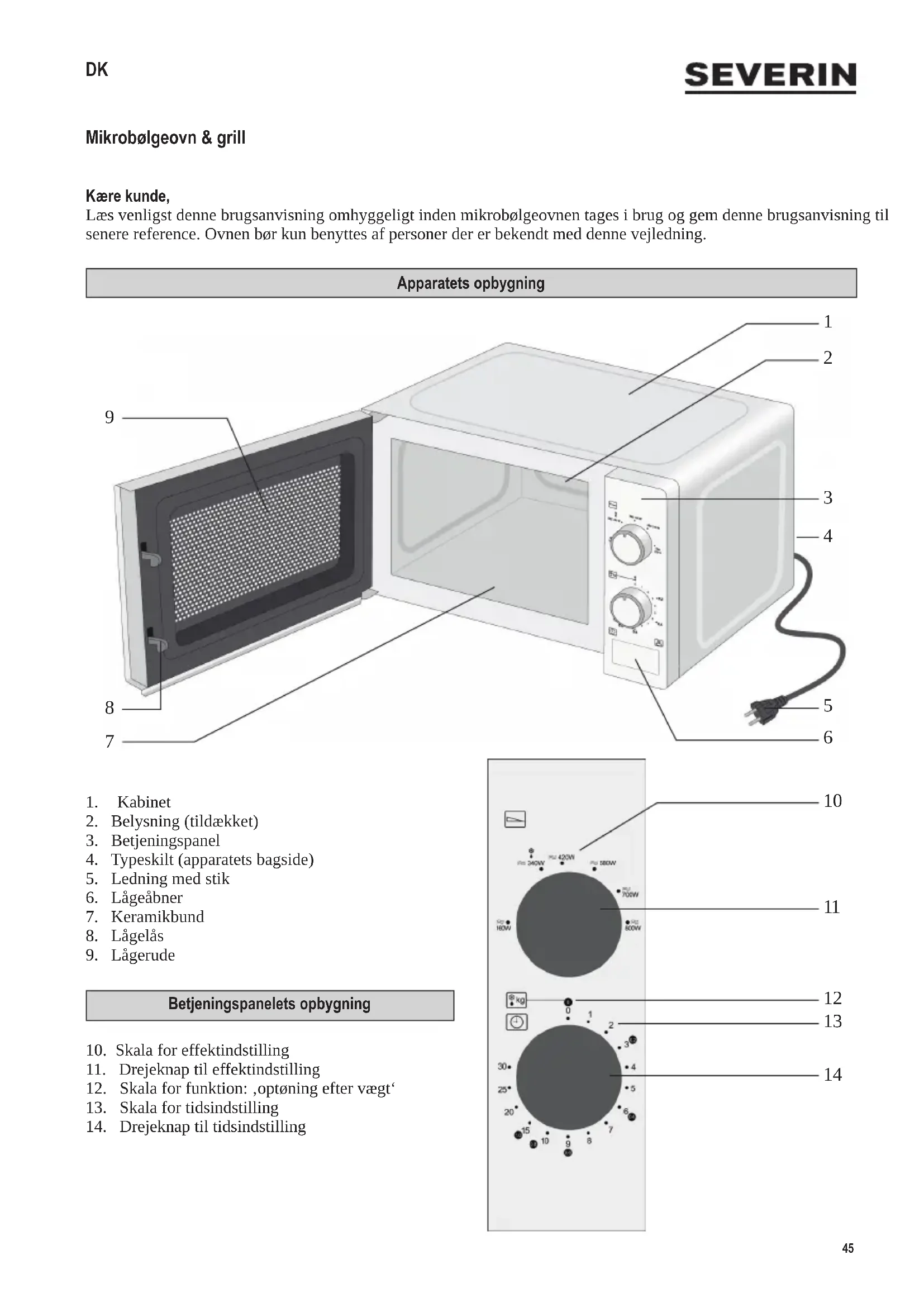 Advarsel: Apparatets ydre ader kan blive varme under brug. Der er også fare for at damp kan udledes gennem ventilationsrillerne: Fare for skoldning. ∙ Lad først apparatet køle tilstrækkeligt af, inden det transporteres. ∙ Lad ikke apparatet eller dets ledning komme i berøring med varme overader eller komme i kontakt med andre varmekilder. ∙ Lad ikke ledningen hænge løst og hold den væk fra alle varme dele. ∙ Hvis apparatet ikke holdes ordentligt rent, kan det forårsage forringelse af overadernes kvalitet, hvilket kan medføre mulig forkortelse af apparatets levetid, såvel som mulig risiko for brugerens sikkerhed. Lågens tætninger, tilberedningsrummet med keramikbund og de tilstødende dele rengøres med en fugtig klud efter hver brug. Detaljeret information om rengøring af apparatet ndes i afsnittet om Rengøring. ∙ Apparatet må ikke rengøres med en damprenser. ∙ Dette apparat er beregnet til privat brug eller i tilsvarende omgivelser, såsom - i tekøkkener, kontorer eller andre mindre virksomheder, - landbrugsvirksomheder, - af kunder på hoteller, moteller m.m. og tilsvarende foretagender, - B&B pensionater.48 142 x 208 mm ∙ Advarsel! Al vedligehold eller reparation som nødvendiggør aftagning af strålebeskyttelsesdækslet udgør en alvorlig fare for uautoriserede personer. Dette gælder også udskiftning af den specielle ledning eller det indvendige lys. Apparatet bør aldrig åbnes af andre end kvalicerede reparatører. Hvis reparation er nødvendig, så send venligst mikrobølgeovnen til en af vore afdelinger for kundeservice. Adresserne kan ndes i tillægget til denne brugsanvisning. ∙ Ved opvarmning af væske i mikrobølgeovnen, kan væsken opvarmes til kogepunktet uden synlige tegn på bobler. Det er derfor vigtigt at der udvises ekstrem forsigtighed når beholderen håndteres, dvs. når den tages ud af ovnen. Denne risiko for at væsken koger over, kan mindskes ved at anbringe en varmefast glasstang i beholderen under opvarmningen. ∙ Hele æg med skal eller hårdkogte æg må aldrig varmes i en mikrobølgeovn da de kan eksplodere selv efter at opvarmningsprocessen er afsluttet. ∙ Advarsel! Det er også farligt at varme væsker eller fødevarer i nogen form for faste hermetisk lukkede beholdere, da disse kan eksplodere. ∙ Indholdet i sutteasker eller glasbeholdere må rystes eller omrøres grundigt for at sikre at varmen er jævnt fordelt. For at undgå pinefuld og farlig skoldning, skal man altid afprøve temperaturen, inden man mader et barn. ∙ Når man varmer eller tilbereder mad, der er indeholdt eller indpakket i et brændbart materiale såsom plastik eller papir, er der altid en fare for at disse materialer antændes. Det er også muligt at maden vil tørre ud eller endda antænde, hvis der vælges for lang kogetid. Fedt eller olie er også brændbare stoffer. Det er derfor vigtigt at overvåge mikrobølgeovnen under betjeningen. Stærkt brændbare væsker såsom koncentreret alkohol må selvfølgelig ikke opvarmes i mikrobølgeovnen. ∙ Hvis det begynder at ryge under betjeningen, holdes døren lukket for at hæmme eller kvæle udvikling af ammer. Sluk øjeblikkeligt for mikrobølgeovnen og tag stikket ud af stikkontakten. ∙ For at undgå forbrændinger, må man altid benytte en passende grydelap, når man tager maden ud af ovnen, eftersom tilbehør og beholdere varmes op sammen med maden. ∙ Stegetermometre (den slags der benyttes i almindelige ovne) er ikke egnede til brug i mikrobølgeovne.49 142 x 208 mm Før brug ∙ Efter udpakningen og inden tilslutning til lysnettet, bør mikrobølgeovnen og dens ledning altid efterses for skader. ∙ Advarsel! Se efter om døren (samt ovnvinduet, dørens forsegling og dørlukkerne) ikke er beskadigede eller bøjede og at døren lukker tæt til dørstolpen. Dette er vigtigt for at sikre at der ikke undslipper mikrobølgeenergi under betjeningen. Af samme grund må hele kabinettet og ovnens indre også regelmæssigt omhyggeligt efterses. Hvis mikrobølgeovnen bliver beskadiget, må den ikke benyttes førend den er blevet repareret af en autoriseret reparatør. ∙ Fjern al ud- og indvendig indpakning. Typeskiltet må ikke fjernes. Denne er fremstillet af materiale egnet til genanvendelse. ∙ Advarsel: Hold børn væk fra emballeringen, da denne udgør en mulig risiko for tilskadekomst, ved f.eks. kvælning. ∙ Inden apparatet benyttes første gang, eller hvis det ikke har været benyttet i en længere periode, må det rengøres grundigt som anvist i afsnittet om Rengøring. ∙ Vigtigt: Tænd aldrig for mikrobølgeovnen medmindre den mad der skal tilberedes eller varmes er blevet placeret inde i ovnen. Opstart af en tom mikrobølgeovn kan resultere i skader på apparatet. Mikrobølgefunktionen (Gruppe II iht. EN 55011) Elektromagnetisk energi genereres inden i mikrobølgeovnen, hvilket får molekylerne i maden (især vandmolekyler) til at vibrere og dette bevirker at maden bliver varm. Fødevarer med højt vandindhold vil derfor varmes op hurtigere end relativt tør mad. Varmen udvikles gradvist inden i maden. Det benyttede tilbehør, beholdere eller plader opvarmes kun indirekte som følge af madens temperatur. ISM-apparat Dette produkt er et ISM-apparat fra gruppe 2 klasse B. Gruppe 2 omfatter alle ISM-apparater (industrielle, videnskabelige, medicinske), hvor der opstår radiofrekvensenergi, og/eller det bruges til bearbejdning af materiale i form af elektromagnetisk udstråling, samt elektroerosionsapparater. Klasse B er apparater til husholdningsbrug eller apparater til strømforsyningsnet, der forsyner beboelsesejendomme. Benyt altid velegnede køkkenredskaber ∙ Tilbered ikke maden direkte på keramikbunden, men på egnet service. ∙ Metalgenstande bør undgås da mikrobølger reekteres fra metalader og måske ikke når frem til den mad der skal tilberedes. Alle former for metal inde i ovnen kan også forårsage gnister, hvilket kan beskadige mikrobølgeovnen. ∙ Som en gener