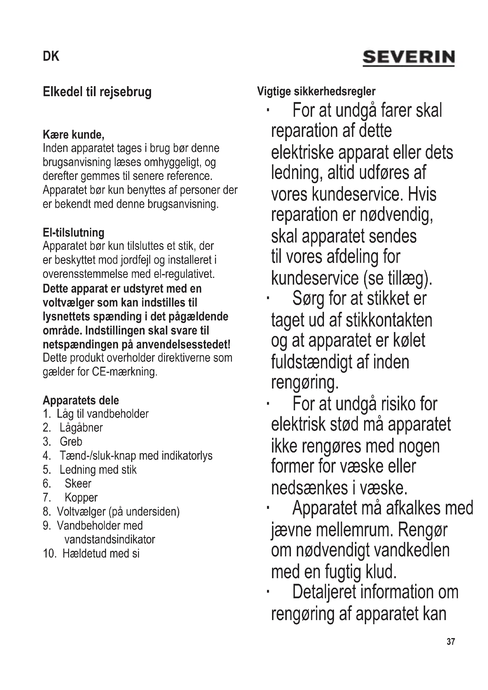 Elkedel til rejsebrug Kære kunde, Inden apparatet tages i brug bør denne brugsanvisning læses omhyggeligt, og derefter gemmes til senere reference. Apparatet bør kun benyttes af personer der er bekendt med denne brugsanvisning. El-tilslutning Apparatet bør kun tilsluttes et stik, der er beskyttet mod jordfejl og installeret i overensstemmelse med el-regulativet. Dette apparat er udstyret med en voltvælger som kan indstilles til lysnettets spænding i det pågældende område. Indstillingen skal svare til netspændingen på anvendelsesstedet! Dette produkt overholder direktiverne som gælder for CE-mærkning. Apparatets dele