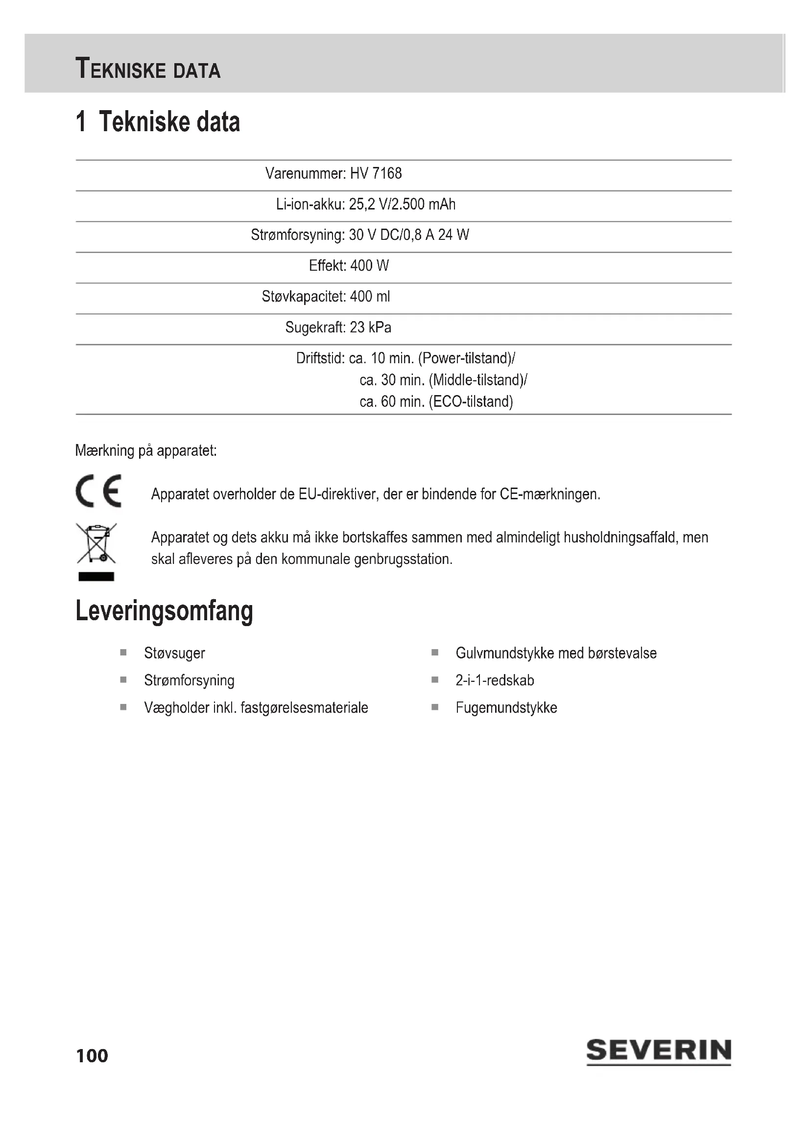 L’apparecchio è di nuovo pronto per l’uso solo con una batteria ricaricabile correttamente funzionante. Se è stata inserita una batteria ricaricabile non funzionante, non mettere in funzione l’apparecchio.96 smalTimEnTo 10 Smaltimento Gli apparecchi e le batterie ricaricabili con questo simbolo devono essere smaltiti separatamen- te dai riuti domestici. Gli apparecchi e le batterie ricaricabili contengono materie prime pregiate che possono essere riutilizzate. Lo smaltimento corretto protegge l’ambiente e la salute delle persone. Consegnare separatamente per lo smaltimento nel relativo centro di raccolta l’appa- recchio e la batteria ricaricabile smontati. L’amministrazione comunale o il proprio rivenditore qualicato forniscono informazioni sullo smaltimento corretto. 11 Garanzia Le condizioni di garanzia che seguono non pregiudicano i diritti alla prestazione in garanzia di legge nei con- fronti del venditore, né eventuali garanzie del venditore. Qualora si rendesse necessaria una riparazione, contattare telefonicamente o per e-mail la nostra Assi- stenza Clienti. I dettagli di contatto sono riportati indicati in appendice alle presenti istruzioni per l’uso. In caso di garanzia, rivolgersi in alternativa anche direttamente al rivenditore. SEVERIN concede inoltre una garanzia produttore di due anni a partire dalla data d’acquisto. In detto periodo viene effettuata senza spese l’eliminazione di tutti i difetti riconducibili in modo dimostrabile a difetti di materiale o di produzione e che compromettono in modo rilevante il funzionamento. Ogni altra rivendicazione è esclusa. Sono esclusi dalla garanzia: Danni riconducibili al mancato rispetto delle istruzioni per l’uso, all’uso non conforme o a normale usura, come pure particolari fragili come ad esempio vetro, plastica o lampadine. In caso d’intervento da parte di soggetti non autorizzati da SEVERIN la garanzia decade. Se questa tabella non è di aiuto, rivolgersi alla nostra Assistenza Clienti. I dettagli di contatto sono indicati in appendice alle presenti istruzioni per l’uso oppure nel sito Web www.severin.de.9798 Mange tak Kære kunde! Vi ønsker dig god fornøjelse med kvalitetsproduktet fra rmaet SEVERIN og takker for din tillid. Dk99 Om denne brugsanvisning Denne brugsanvisning indeholder vigtige tips for din sikkerhed og for brugen af apparatet. Hvis brugsanvisnin- gen ikke følges, kan det medføre personskader eller beskadigelse af apparatet. Opbevar brugsanvisningen et sikkert sted. Hvis apparatet videregives til tredjemand, skal brugsanvisningen også videregives. Læs brugsan- visningen helt igennem før første ibrugtagning. Kvikstartguide med billeder medfølger Med brugsanvisningen følger en kvikstartguide, som giver dig ere tips for brug og pleje af apparatet. Brugsanvisningen og kvikstartguiden kan efter behov downloades gratis via internettet under www.severin.de. Indhold 1 Tekniske data 100 2 Sikkerhedshenvisninger 101 3 Montering og opladning af apparatet 106 4 Støvsugning 107 5 Rengøring og vedligeholdelse af apparatet 108 6 Opbevaring af apparatet 110 7 Reservedele/tilbehør 110 8 Egenhændig afhjælpning af problemer 110 9 Udtagning/udskiftning af akku 111 10 Bortskaffelse 111 11 Garanti 112 Dk100 TEkniskE DaTa 1 Tekniske data Varenummer: HV 7168 Li-ion-akku: 25,2 V/2.500 mAh Strømforsyning: 30 V DC/0,8 A 24 W Effekt: 400 W Støvkapacitet: 400 ml Sugekraft: 23 kPa Driftstid: ca. 10 min. (Power-tilstand)/ ca. 30 min. (Middle-tilstand)/ ca. 60 min. (ECO-tilstand) Mærkning på apparatet: Apparatet overholder de EU-direktiver, der er bindende for CE-mærkningen. Apparatet og dets akku må ikke bortskaffes sammen med almindeligt husholdningsaffald, men skal aeveres på den kommunale genbrugsstation. Leveringsomfang Støvsuger Strømforsyning Vægholder inkl. fastgørelsesmateriale Gulvmundstykke med børstevalse 2-i-1-redskab Fugemundstykke101 sikkErhEDshEnVisninGEr 2 Sikkerhedshenvisninger Bestemte persongrupper Dette apparat kan anvendes af børn fra 8 år og ældre og af personer med nedsatte fysiske, sensoriske eller mentale evner eller mangel på erfaring og/ eller viden, hvis de er under opsyn eller er blevet instrueret i sikker brug af apparatet og har forstået de farer, der kan opstå i den forbindelse. Børn må ikke lege med apparatet eller stille eller sætte sig på apparatet. Rengøring og brugervedligeholdelse må ikke foretages af børn uden opsyn. Børn under 8 år skal holdes væk fra apparatet samt strømforsyningen. Emballagematerialet er ikke legetøj. Der er fare for kvælning. Sikker tilslutning af apparatet Da apparatet drives med elektrisk strøm, er der fare for elektrisk stød. Derfor gælder følgende: Kontrollér apparatet og strømforsyningen for eventuelle skader før brugen. Anvend aldrig et defekt apparat eller et apparat med defekt strømforsyning. Slut kun strømforsyningen til stikkontakter, som opfylder oplysningerne på strømforsyningens typeskilt.102 sikkErhEDshEnVisninGEr Forsøg aldrig selv at reparere apparatet eller strømforsyningen. For at undgå farlige situationer skal reparationer på apparatet og strømforsyningen altid udføres af vores kundeservice. Indlevér et defekt apparat til reparation hos en forhandler, eller kontakt SEVERINs kundeservice (kontaktoplysninger ndes i bilaget til denne brugsanvisning eller på www.severin.de). Sænk ikke apparatet eller strømforsyningen ned i vand eller andre væsker, og behandl dem ikke med væsker. Hold apparatet og strømforsyningen på sikker afstand af regn og fugt. Anvend ikke apparatet og strømforsyningen udendørs eller i rum med høj luftfugtighed. Berør ikke apparatet og strømforsyningen med våde hænder. Træk altid direkte i strømforsyningen, når du trækker den ud af stikkontakten. Pas på, at strømforsyningens kabel ikke knækkes, kommer i klemme eller køres over eller kommer i kontakt med varmekilder, fugt eller skarpe kanter. Sørg for, at strømforsyningens kabel ikke tr