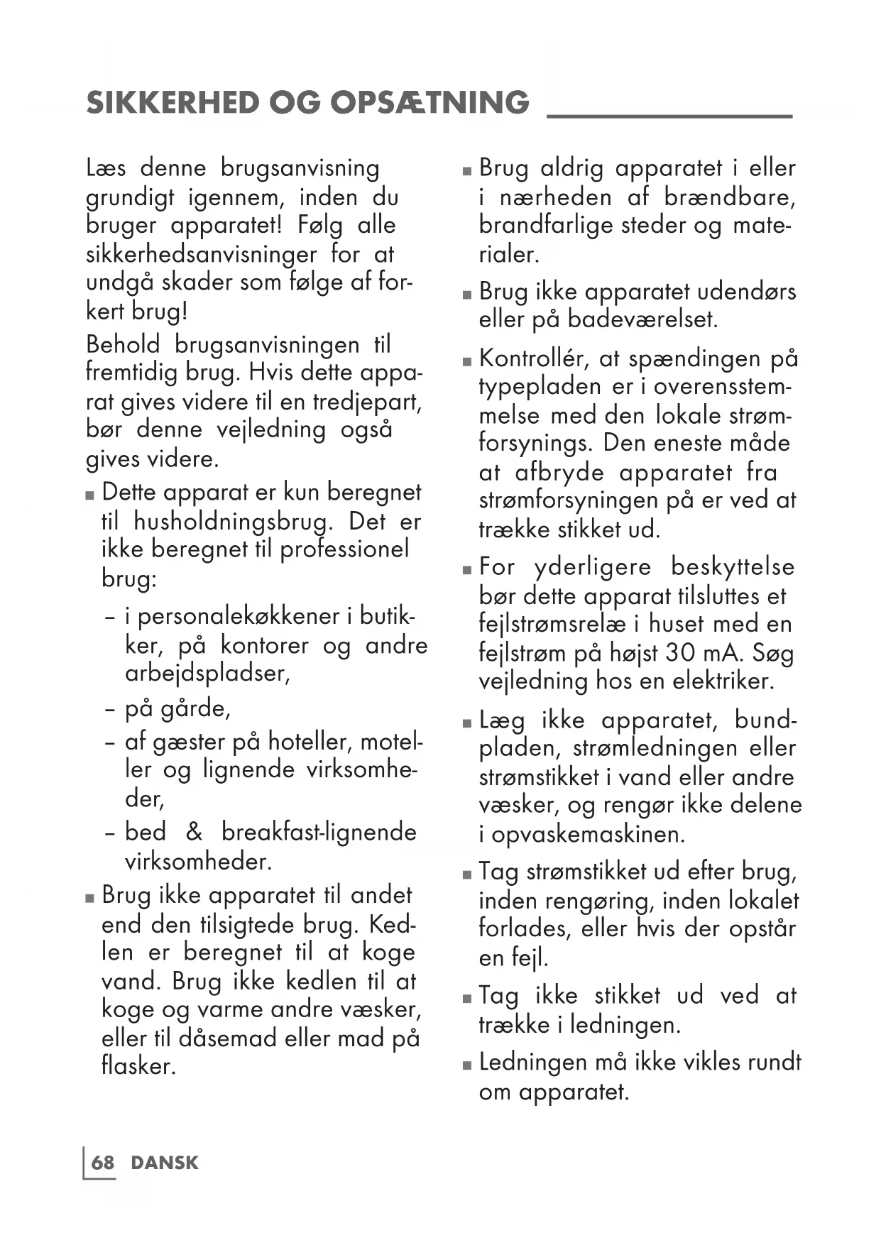 Brug ikke apparatet til andet end den tilsigtede brug. Ked- len er beregnet til at koge vand. Brug ikke kedlen til at koge og varme andre væsker, eller til dåsemad eller mad på flasker.