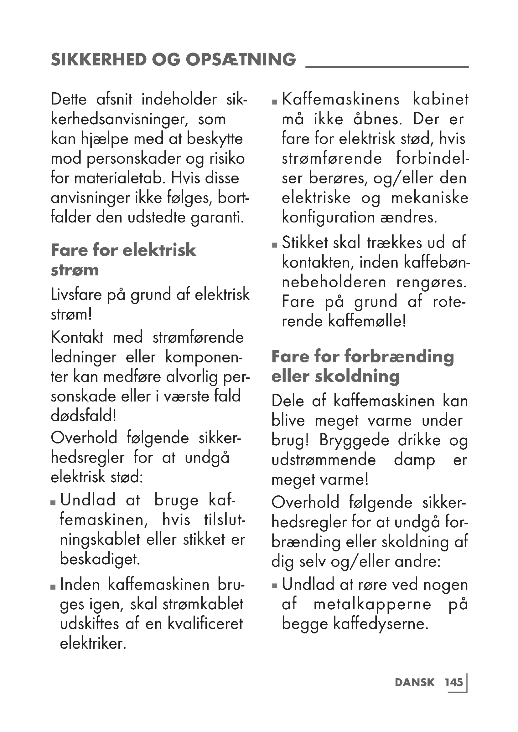 Stikket skal trækkes ud af kontakten, inden kaffebøn- nebeholderen rengøres. Fare på grund af rote- rende kaffemølle! Fare for forbrænding eller skoldning Dele af kaffemaskinen kan blive meget varme under brug! Bryggede drikke og udstrømmende damp er meget varme! Overhold følgende sikker- hedsregler for at undgå for- brænding eller skoldning af dig selv og/eller andre: