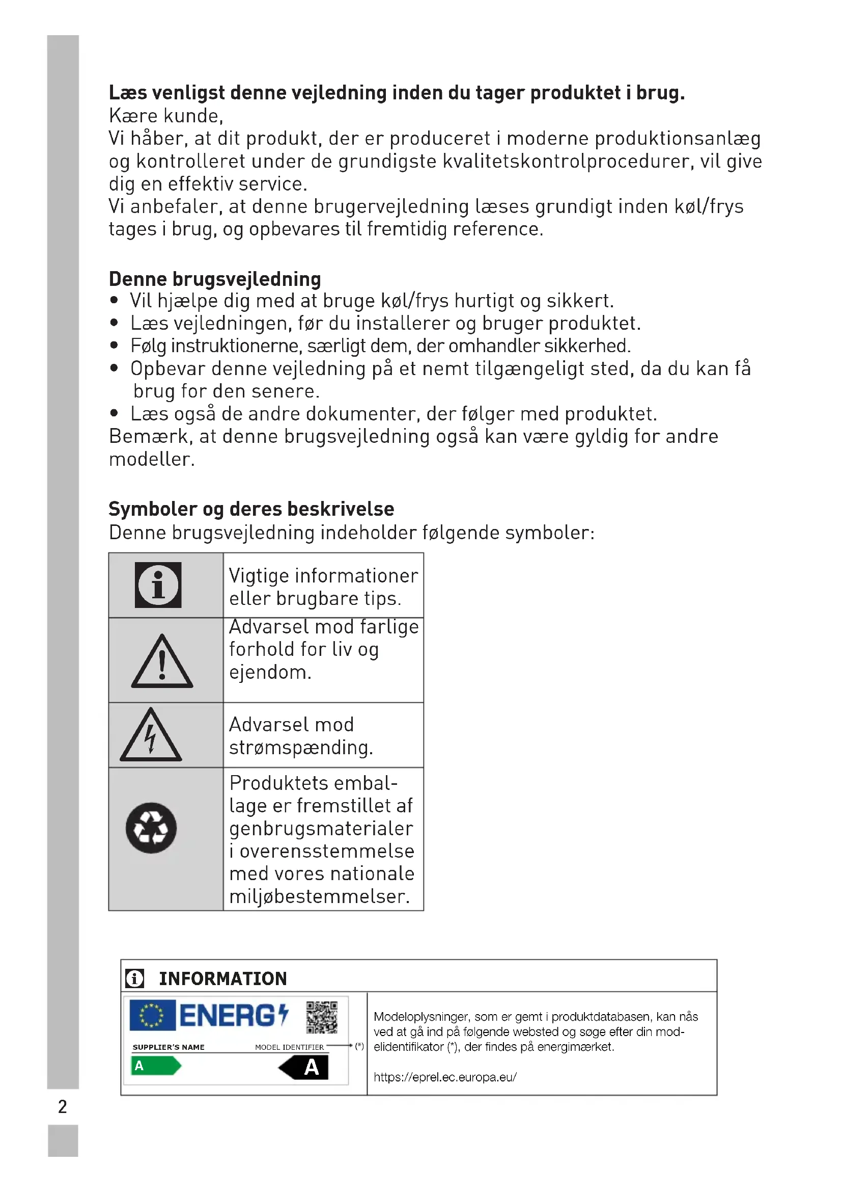 Læs venligst denne vejledning inden du tager produktet i brug. Kære kunde, Vi håber, at dit produkt, der er produceret i moderne produktionsanlæg og kontrolleret under de grundigste kvalitetskontrolprocedurer, vil give dig en effektiv service. Vi anbefaler, at denne brugervejledning læses grundigt inden køl/frys tages i brug, og opbevares til fremtidig reference. Denne brugsvejledning