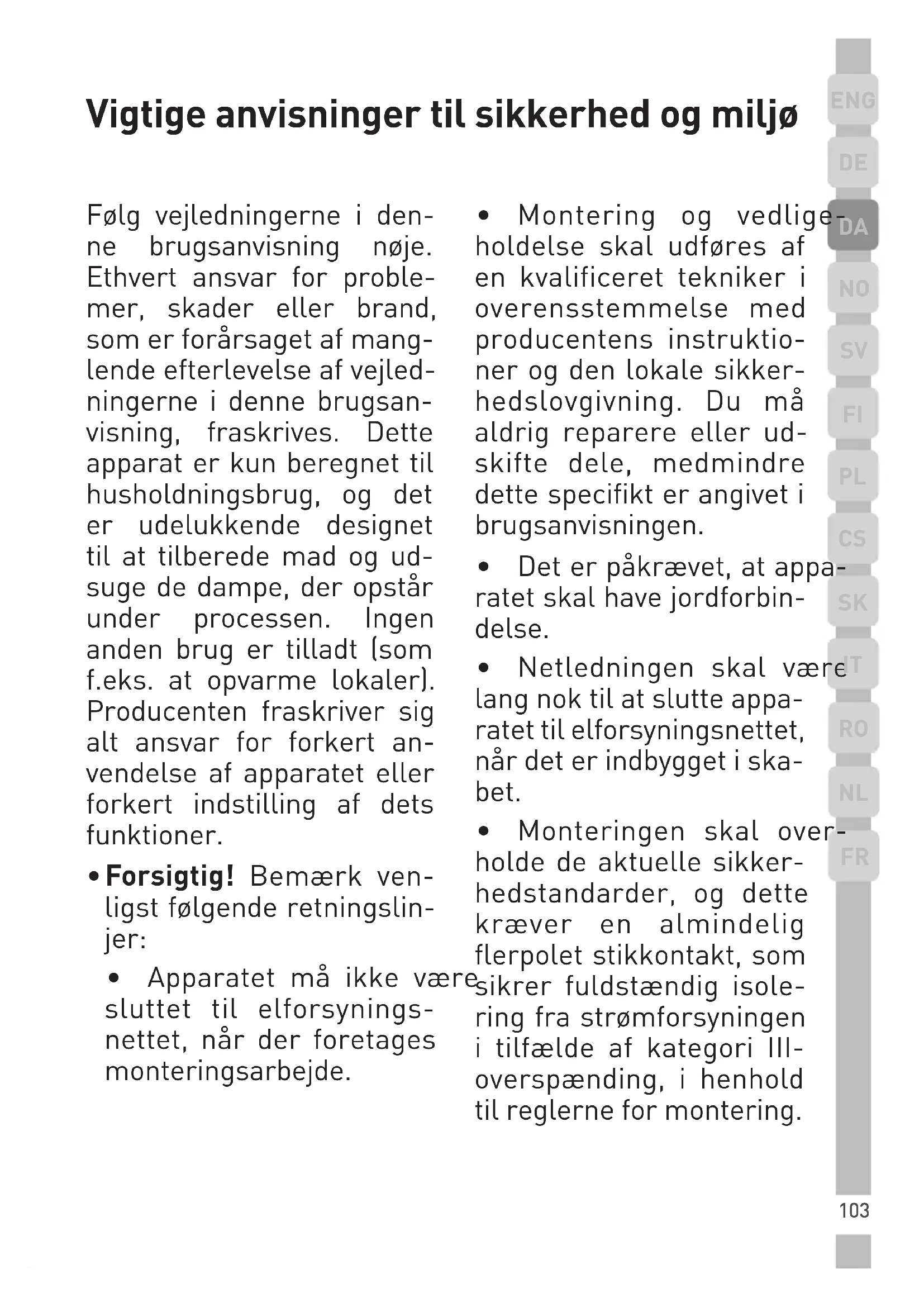 Aus- und Wiedereinschalten des Gerätes behoben wird. Falls der Fehler nach den obigen Prüfungen weiterhin besteht, wenden Sie sich an den nächstgelegenen Kundendienst.103 Vigtige anvisninger til sikkerhed og miljø Følg vejledningerne i den- ne brugsanvisning nøje. Ethvert ansvar for proble- mer, skader eller brand, som er forårsaget af mang- lende efterlevelse af vejled- ningerne i denne brugsan- visning, fraskrives. Dette apparat er kun beregnet til husholdningsbrug, og det er udelukkende designet til at tilberede mad og ud- suge de dampe, der opstår under processen. Ingen anden brug er tilladt (som f.eks. at opvarme lokaler). Producenten fraskriver sig alt ansvar for forkert an- vendelse af apparatet eller forkert indstilling af dets funktioner.