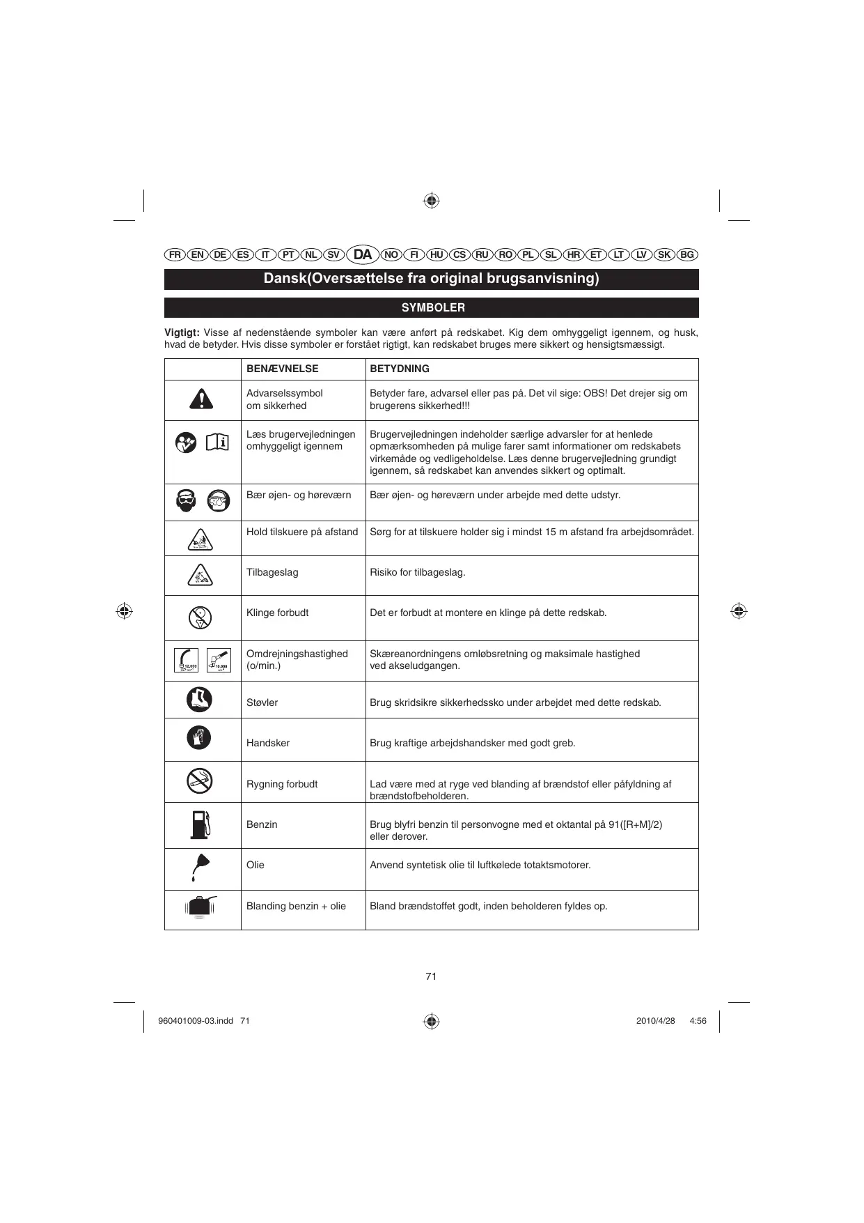 Dansk(Oversættelse fra original brugsanvisning) SYMBOLER Vigtigt: Visse af nedenstående symboler kan være anført på redskabet. Kig dem omhyggeligt igennem, og husk, hvad de betyder. Hvis disse symboler er forstået rigtigt, kan redskabet bruges mere sikkert og hensigtsmæssigt. BENÆVNELSE BETYDNING Advarselssymbol om sikkerhed Betyder fare, advarsel eller pas på. Det vil sige: OBS! Det drejer sig om brugerens sikkerhed!!! Læs brugervejledningen omhyggeligt igennem Brugervejledningen indeholder særlige advarsler for at henlede opmærksomheden på mulige farer samt informationer om redskabets virkemåde og vedligeholdelse. Læs denne brugervejledning grundigt igennem, så redskabet kan anvendes sikkert og optimalt. Bær øjen- og høreværn Bær øjen- og høreværn under arbejde med dette udstyr. Hold tilskuere på afstand Sørg for at tilskuere holder sig i mindst 15 m afstand fra arbejdsområdet. Tilbageslag Risiko for tilbageslag. Klinge forbudt Det er forbudt at montere en klinge på dette redskab. Omdrejningshastighed (o/min.) Skæreanordningens omløbsretning og maksimale hastighed ved akseludgangen. Støvler Brug skridsikre sikkerhedssko under arbejdet med dette redskab. Handsker Brug kraftige arbejdshandsker med godt greb. Rygning forbudt Lad være med at ryge ved blanding af brændstof eller påfyldning af brændstofbeholderen. Benzin Brug blyfri benzin til personvogne med et oktantal på 91([R+M]/2) eller derover. Olie Anvend syntetisk olie til luftkølede totaktsmotorer. Blanding benzin + olie Bland brændstoffet godt, inden beholderen fyldes op.