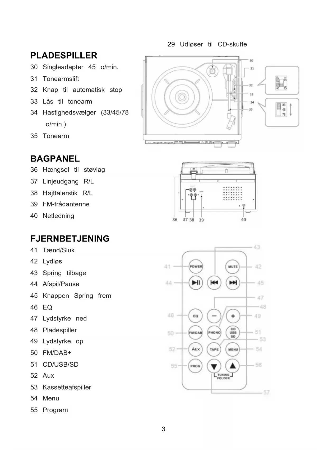 1 Støvlåg 2 Pladespiller 3 Knappen Tilstand (EQ) 4 Knappen Menu/Info 5 Knappen Program 6 Knappen Optag 7 Aux-indgang 8 Knappen Slet 9 3,5 mm stik til hovedtelefoner 10 USB-stik 11 Indstik til SD/MMC 12 LCD-display 13 Knapper til KASSETTEAFSPILLER 1 14 Diskskuffe 15 Knappen Afspil/Pause 16 Knappen FM-tuning 17 Knappen Tænd/Sluk/Lydstyrke 18 Knappen Spring frem 19 Indikatorlampe for Standby/tændt (ved siden af displayet) 20 Knappen Stop (ved siden af displayet) 21 Knappen Spring tilbage (ved siden af displayet) 22 Knappen Kassetteafspiller 23 Knappen Aux 24 Knappen CD/USB/SD 25 Knappen Pladespiller 26 Knappen FM/DAB 27 Modtager til fjernbetjening 28 Knapper til KASSETTEAFSPILLER 23 29 Udløser til CD-skuffe PLADESPILLER 30 Singleadapter 45 o/min. 31 Tonearmslift 32 Knap til automatisk stop 33 Lås til tonearm 34 Hastighedsvælger (33/45/78 o/min.) 35 Tonearm BAGPANEL 36 Hængsel til støvlåg 37 Linjeudgang R/L 38 Højttalerstik R/L 39 FM-trådantenne 40 Netledning FJERNBETJENING 41 Tænd/Sluk 42 Lydløs 43 Spring tilbage 44 Afspil/Pause 45 Knappen Spring frem 46 EQ 47 Lydstyrke ned 48 Pladespiller 49 Lydstyrke op 50 FM/DAB+