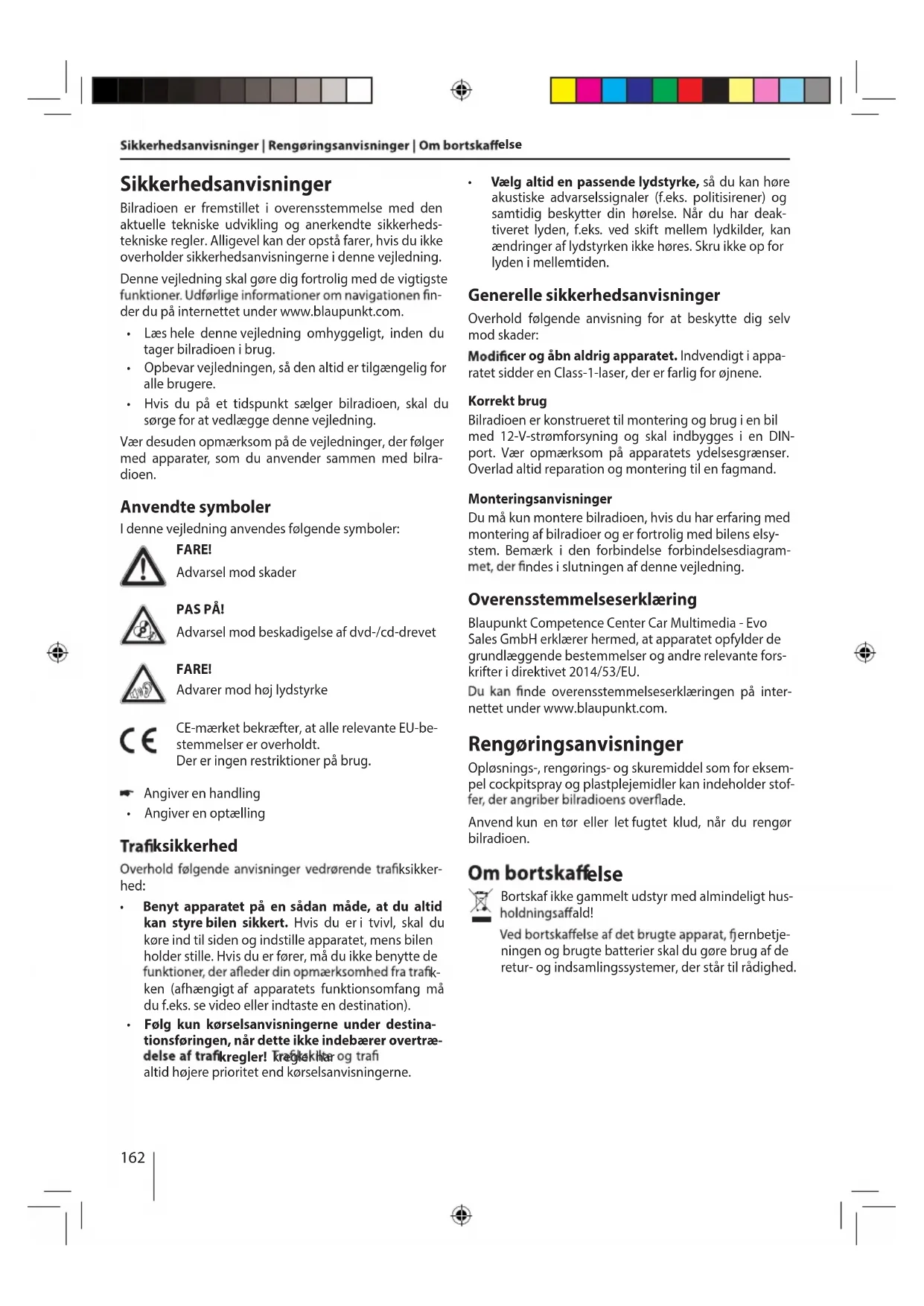 - Vælg altid en passende lydstyrke, så du kan høre akustiske advarselssignaler (f.eks. politisirener) og samtidig beskytter din hørelse. Når du har deak- tiveret lyden, f.eks. ved skift mellem lydkilder, kan ændringer af lydstyrken ikke høres. Skru ikke op for lyden i mellemtiden. Generelle sikkerhedsanvisninger Overhold følgende anvisning for at beskytte dig selv mod skader: cer og åbn aldrig apparatet. Indvendigt i appa- ratet sidder en Class-1-laser, der er farlig for øjnene. Korrekt brug Bilradioen er konstrueret til montering og brug i en bil med 12-V-strømforsyning og skal indbygges i en DIN- port. Vær opmærksom på apparatets ydelsesgrænser. Overlad altid reparation og montering til en fagmand. Monteringsanvisninger Du må kun montere bilradioen, hvis du har erfaring med montering af bilradioer og er fortrolig med bilens elsy- stem. Bemærk i den forbindelse forbindelsesdiagram- ndes i slutningen af denne vejledning. Overensstemmelseserklæring nde overensstemmelseserklæringen på inter- nettet under www.blaupunkt.com. Rengøringsanvisninger Opløsnings-, rengørings- og skuremiddel som for eksem- pel cockpitspray og plastplejemidler kan indeholder stof- ade. Anvend kun en tør eller let fugtet klud, når du rengør bilradioen. else Bortskaf ikke gammelt udstyr med almindeligt hus- ald! ernbetje- ningen og brugte batterier skal du gøre brug af de retur- og indsamlingssystemer, der står til rådighed. Blaupunkt Competence Center Car Multimedia - Evo Sales GmbH erklærer hermed, at apparatet opfylder de grundlæggende bestemmelser og andre relevante fors- krifter i direktivet 2014/53/EU. stemmelser er overholdt. Der er ingen restriktioner på brug.163 DANSK Medfølgende dele Følgende dele følger med ved levering: