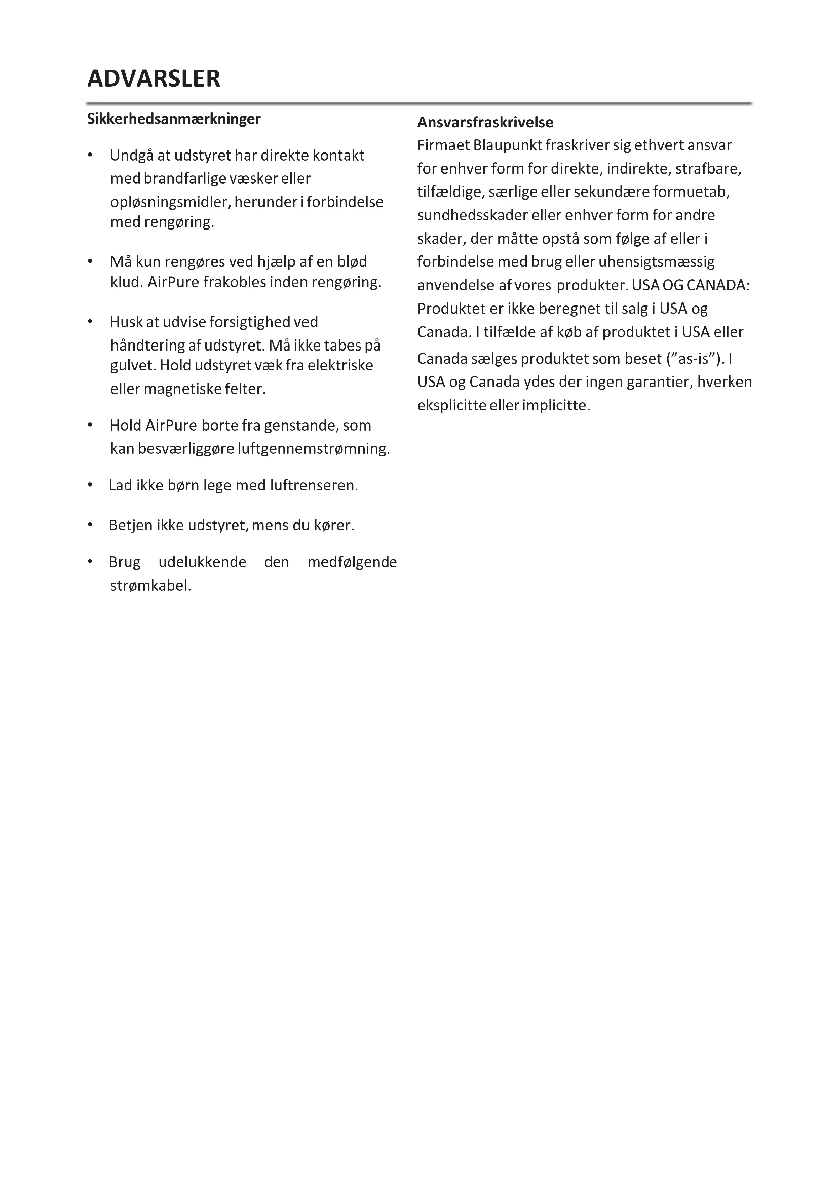 - Brug udelukkende den medfølgende strømkabel. Ansvarsfraskrivelse Firmaet Blaupunkt fraskriver sig ethvert ansvar for enhver form for direkte, indirekte, strafbare, tilfældige, særlige eller sekundære formuetab, sundhedsskader eller enhver form for andre skader, der måtte opstå som følge af eller i forbindelse med brug eller uhensigtsmæssig anvendelse af vores produkter. USA OG CANADA: Produktet er ikke beregnet til salg i USA og Canada. I tilfælde af køb af produktet i USA eller Canada sælges produktet som beset (”as-is”). I USA og Canada ydes der ingen garantier, hverken eksplicitte eller implicitte.