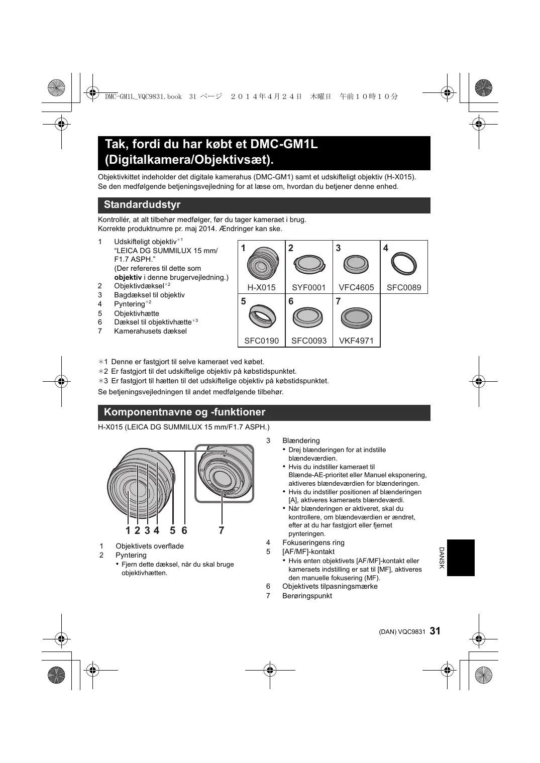 VKF4971 ¢1 Denne er fastgjort til selve kameraet ved købet. ¢2 Er fastgjort til det udskiftelige objektiv på købstidspunktet. ¢3 Er fastgjort til hætten til det udskiftelige objektiv på købstidspunktet. Se betjeningsvejledningen til andet medfølgende tilbehør. Komponentnavne og -funktioner H-X015 (LEICA DG SUMMILUX 15 mm/F1.7 ASPH.)
