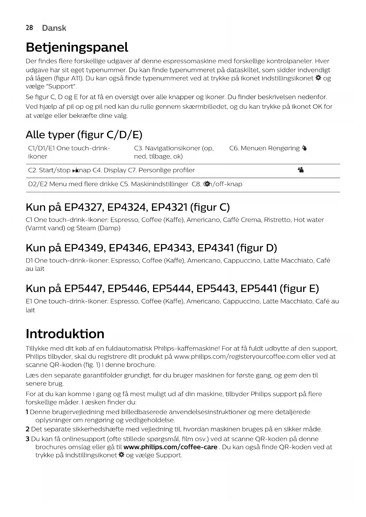 vælge "Support". Se figur C, D og E for at få en oversigt over alle knapper og ikoner. Du finder beskrivelsen nedenfor. Ved hjælp af pil op og pil ned kan du rulle gennem skærmbilledet, og du kan trykke på ikonet OK for at vælge eller bekræfte dine valg. Alle typer (figur C/D/E) C1/D1/E1 One touch-drink- ikoner C3. Navigationsikoner (op, ned, tilbage, ok) C6. Menuen Rengøring C2. Start/stop knap C4. Display C7. Personlige profiler D2/E2 Menu med flere drikke C5. Maskinindstillinger C8. On/off-knap Kun på EP4327, EP4324, EP4321 (figur C) C1 One touch-drink-ikoner: Espresso, Coffee (Kaffe), Americano, Caffè Crema, Ristretto, Hot water (Varmt vand) og Steam (Damp) Kun på EP4349, EP4346, EP4343, EP4341 (figur D) D1 One touch-drink-ikoner: Espresso, Coffee (Kaffe), Americano, Cappuccino, Latte Macchiato, Café au lait Kun på EP5447, EP5446, EP5444, EP5443, EP5441 (figur E) E1 One touch-drink-ikoner: Espresso, Coffee (Kaffe), Americano, Cappuccino, Latte Macchiato, Café au lait Introduktion Tillykke med dit køb af en fuldautomatisk Philips-kaffemaskine! For at få fuldt udbytte af den support, Philips tilbyder, skal du registrere dit produkt på www.philips.com/registeryourcoffee.com eller ved at scanne QR-koden (fig. 1) i denne brochure. Læs den separate garantifolder grundigt, før du bruger maskinen for første gang, og gem den til senere brug. For at du kan komme i gang og få mest muligt ud af din maskine, tilbyder Philips support på flere forskellige måder. I æsken finder du: 1 Denne brugervejledning med billedbaserede anvendelsesinstruktioner og mere detaljerede oplysninger om rengøring og vedligeholdelse. 2 Det separate sikkerhedshæfte med vejledning til, hvordan maskinen bruges på en sikker måde. 3 Du kan få onlinesupport (ofte stillede spørgsmål, film osv.) ved at scanne QR-koden på denne brochures omslag eller gå til www.philips.com/coffee-care . Du kan også finde QR-koden ved at trykke på indstillingsikonet og vælge Support.
