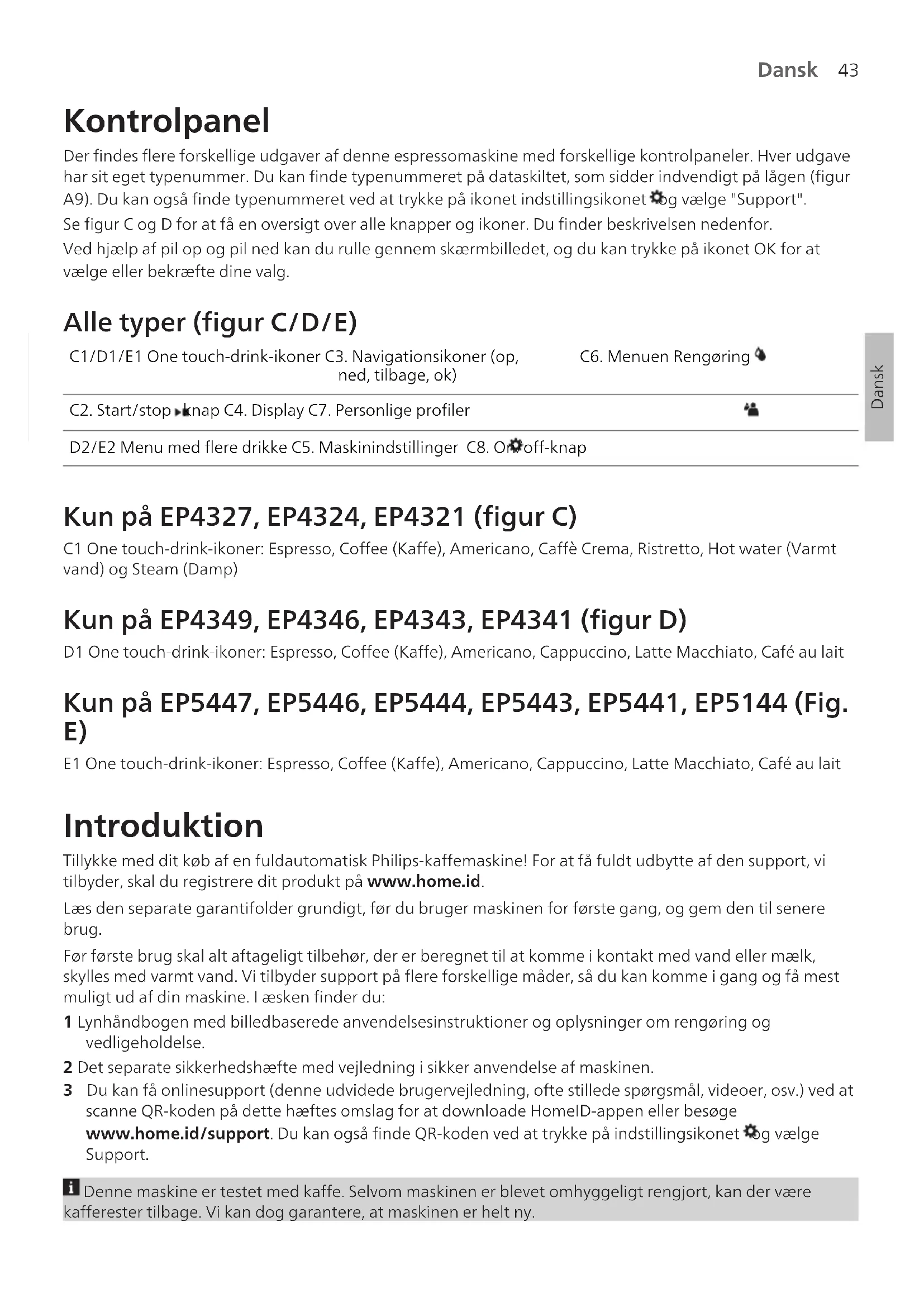 E1 One touch-drink-ikoner: Espresso, Coffee (Kaffe), Americano, Cappuccino, Latte Macchiato, Café au lait Introduktion Tillykke med dit køb af en fuldautomatisk Philips-kaffemaskine! For at få fuldt udbytte af den support, vi tilbyder, skal du registrere dit produkt på www.home.id. Læs den separate garantifolder grundigt, før du bruger maskinen for første gang, og gem den til senere brug. Før første brug skal alt aftageligt tilbehør, der er beregnet til at komme i kontakt med vand eller mælk, skylles med varmt vand. Vi tilbyder support på flere forskellige måder, så du kan komme i gang og få mest muligt ud af din maskine. I æsken finder du: 1 Lynhåndbogen med billedbaserede anvendelsesinstruktioner og oplysninger om rengøring og vedligeholdelse. 2 Det separate sikkerhedshæfte med vejledning i sikker anvendelse af maskinen. 3 Du kan få onlinesupport (denne udvidede brugervejledning, ofte stillede spørgsmål, videoer, osv.) ved at scanne QR-koden på dette hæftes omslag for at downloade HomeID-appen eller besøge www.home.id/support. Du kan også finde QR-koden ved at trykke på indstillingsikonet og vælge Support. Denne maskine er testet med kaffe. Selvom maskinen er blevet omhyggeligt rengjort, kan der være kafferester tilbage. Vi kan dog garantere, at maskinen er helt ny.44 Dansk Maskinen justerer automatisk den mængde formalet kaffe, der bruges til at brygge den mest velsmagende kaffe. Du skal først brygge 5 kopper kaffe for at lade maskinen gennemføre sin selvjustering. Skyl LatteGo (mælkebeholderen) eller den klassiske mælkeskummer, inden den tages i brug første gang. Før apparatet tages i brug