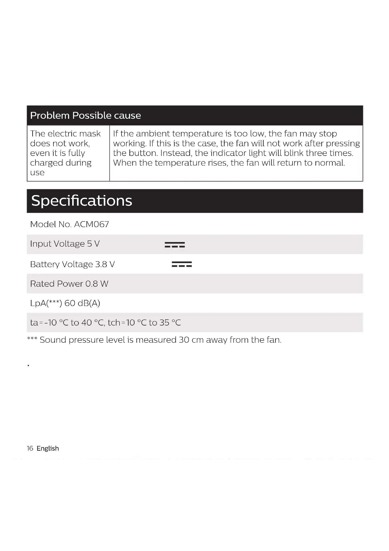 - Før masken opbevares i længere tid, oplades den elektriske blæser, og masken opbevares derefter på et tørt og køligt sted. Under opbevaring skal masken oplades en gang hvert halve år. Fejlnding Dette afsnit opsummerer de mest almindelige problemer, der kan forekomme ved brug af apparatet. Hvis du ikke kan løse problemet ved hjælp af nedenstående oplysninger, kan du kontakte dit lokale Philips Kundecenter. Problem Mulig årsag Masken passer ikke ordentligt. Ånd kraftigt ind og ud. Hvis der siver luft ud omkring næsen, skal næseclipsen justeres. Hvis der lækker luft langs kanterne, skal du justere ørestropperne. Batteriets levetid er reduceret Den faktiske driftstid påvirkes af blæserens hastighedsindstilling og den omgivende temperatur. Batteriet er designet til at beholde op til 80 % af sin oprindelige kapacitet efter 300 fulde opladningscyklusser. Unormal brug (f.eks. udsættelse for vand eller ekstrem kulde) vil gøre, at batterikapaciteten reduceres hurtigere. Opladning mislykkes Hvis indikatoren blinker tre gange, kan omgivelsestemperaturen være for høj eller for lav til opladning. Den anbefalede temperatur under opladning er mellem 10 °C og 35 °C. I andre tilfælde skal du prøve en anden oplader eller et andet opladerkabel. Der er vanddamp i blæseren Hvis der er lav udendørstemperatur, kan vanddampen, der udåndes af den menneskelige krop, kondensere og naturligt udledes fra maskens blæserholder til luftudgang. Dette er normalt, og vanddampen vil ikke påvirke produktets sikkerhed eller blæserens ydeevne. AMC067-AirMasks_3000.062.5277.2_BOOKLET_120x120mm_BW.indd 27AMC067-AirMasks_3000.062.5277.2_BOOKLET_120x120mm_BW.indd 27 01-03-21 11:2501-03-21 11:2528 Deutsch Problem Mulig årsag Blæserhastigheden svinger op og ned Når strømmen er lav, vil blæserhastigheden svinge op og ned 3 gange for at informere brugeren. I omgivelser med lav temperatur sænkes den elektriske blæsers hastighed automatisk. Hastighedsindstillingen ændres automatisk tilbage, når temperaturen stiger. Den elektriske maske virker ikke under brug, selv om den er fuldt opladet Hvis omgivelsestemperaturen er for lav, kan blæseren holde op med at fungere. Hvis dette er tilfældet, vil blæseren ikke gå i gang, når der trykkes på knappen. I stedet blinker indikatorlyset tre gange. Når temperaturen stiger, vil blæseren vende tilbage til normal funktion. Specikationer Modelnr. ACM067 Indgangsspænding 5 V Batterispænding 3,8 V Nominel eekt 0,8 W LpA(***) 60 dB(A) ta=-10 °C til 40 °C, tch=10 °C til 35 °C *** Lydtrykniveauet er mål 30 cm fra blæseren. Vorgesehener Verwendungszweck Die ACM067 ist eine Frischluftmaske. Sie kann ergänzend zu bereits bestehenden Schutzmaßnahmen und sozialen Distanzbestimmungen eingesetzt werden. Die Maske ist für gesunde Personen bestimmt, die keine klinischen Symptome einer Infektion durch Viren oder Bakterien aufweisen und nicht direkt mit Personen in Kontakt kommen, die solche Symptome aufweisen. Diese Maske ist weder eine Atemschutzmaske (PSA im Sinne der Verordnung (EU) 2016/425) noch eine medizinische/chirurgische Maske (Medizinprodukt im Sinne der Verordnung (EU) 2017/745). Sie darf nicht von Gesundheitspersonal mit Patientenkontakt verwendet werden. Wichtig Warnhinweis