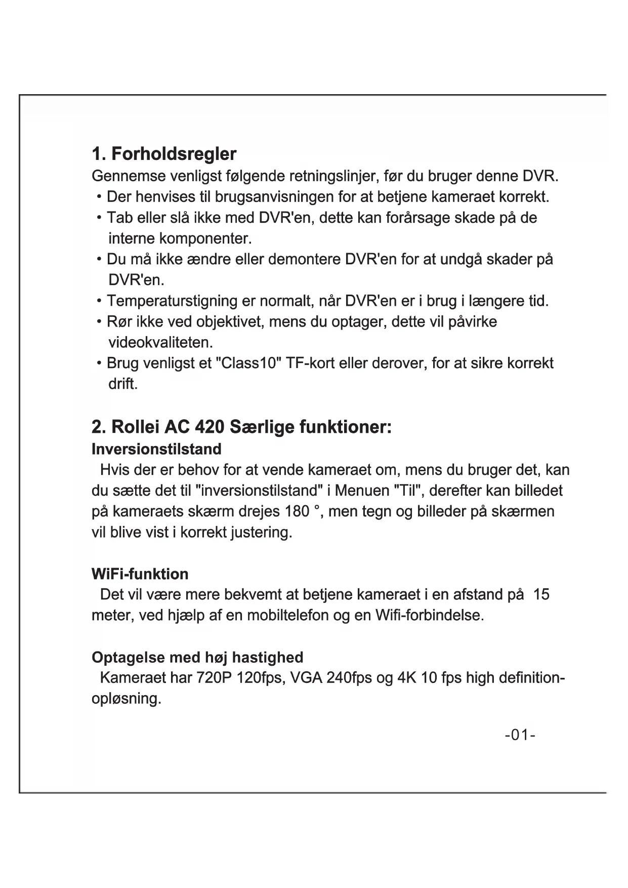 Inversionstilstand Hvis der er behov for at vende kameraet om, mens du bruger det, kan du sætte det til "inversionstilstand" i Menuen "Til", derefter kan billedet på kameraets skærm drejes 180 °, men tegn og billeder på skærmen vil blive vist i korrekt justering. WiFi-funktion Det vil være mere bekvemt at betjene kameraet i en afstand på 15 meter, ved hjælp af en mobiltelefon og en Wifi-forbindelse. Kameraet har 720P 120fps, VGA 240fps og 4K 10 fps high definition- opløsning. Optagelse med høj hastighed -01--02- Slowmotion Videoen vil blive vist dobbelt så langsomt som videobilledet (60fps video) eller 4 gange (120fps video). Tidsforskydning DVR'en vil tage billeder på en bestemt sats, og derefter lave en video der består af billederne. Optagetilstand Under optagelse tryk på knappen Tilstand, for at tage et stillbillede. Det fungerer ikke kun ved manuel optagelse, men kan også indstilles automatisk, hvilket gør det endnu mere bekvemt. 2,4 G trådløs fjernbetjening Vandtæt håndledsfjernbetjening Dykningstilstand Videoens farve under vand vil være den samme som normalt, når "Dykningstilstand" er slået til.