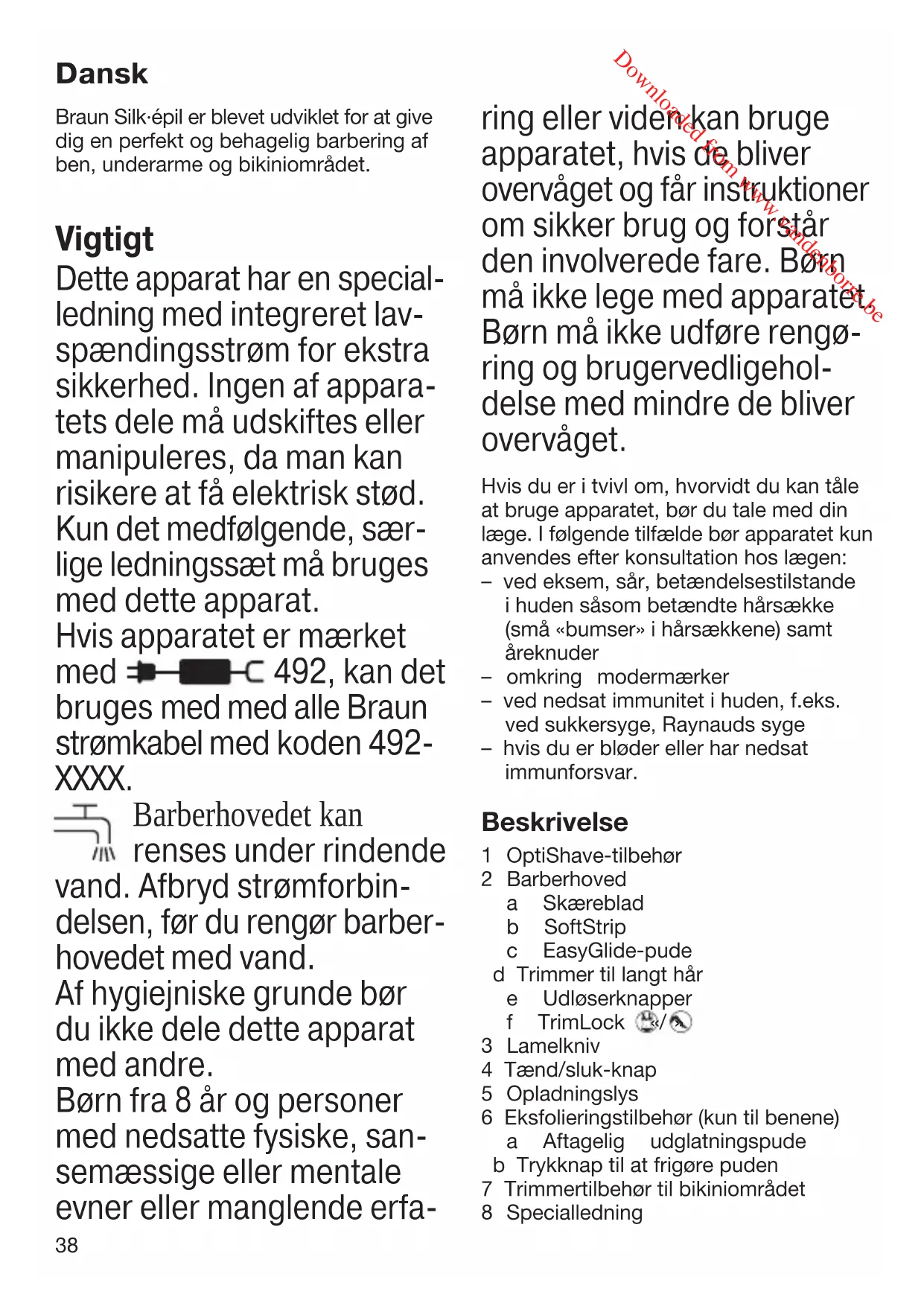 - Takket være den bekvemme dobbelt- funktion kan din Braun Silk·épil også anvendes, selvom de genopladelige batterier er afladet, ved at slutte maski- nen til en stikkontakt med specialled- ningen. Barbering Silk&Soft-systemet får også fat i problemhår og giver silkeglat hud. Den indbyggede SoftStrip strækker huden for at sikre, at der gribes fat om hårene længere nede, samtidig med at det svævende skæreblad og den svævende trimmer til langt hår glider tæt ind mod huden. Dette sikrer en perfekt og tæt barbering. EasyGlide-puden giver en nænsom barbering ved at sikre, at bar- bermaskinen glider let. Derved mindskes eventuel hudirritation. OptiShave-tilbehøret giver en ekstratæt og behagelig barbering af benene.