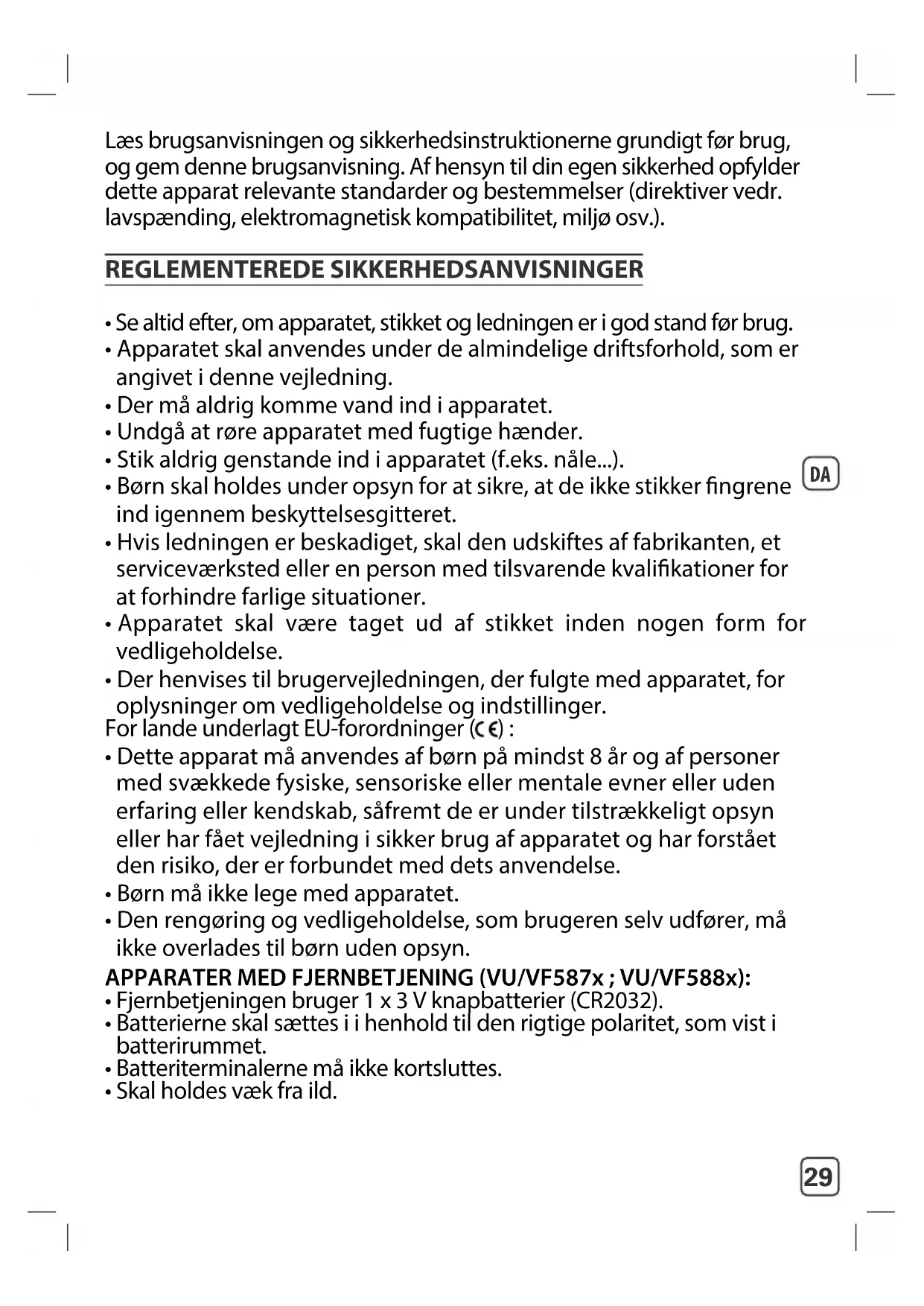 - Den rengøring og vedligeholdelse, som brugeren selv udfører, må ikke overlades til børn uden opsyn. APPARATER MED FJERNBETJENING (VU/VF587x ; VU/VF588x):