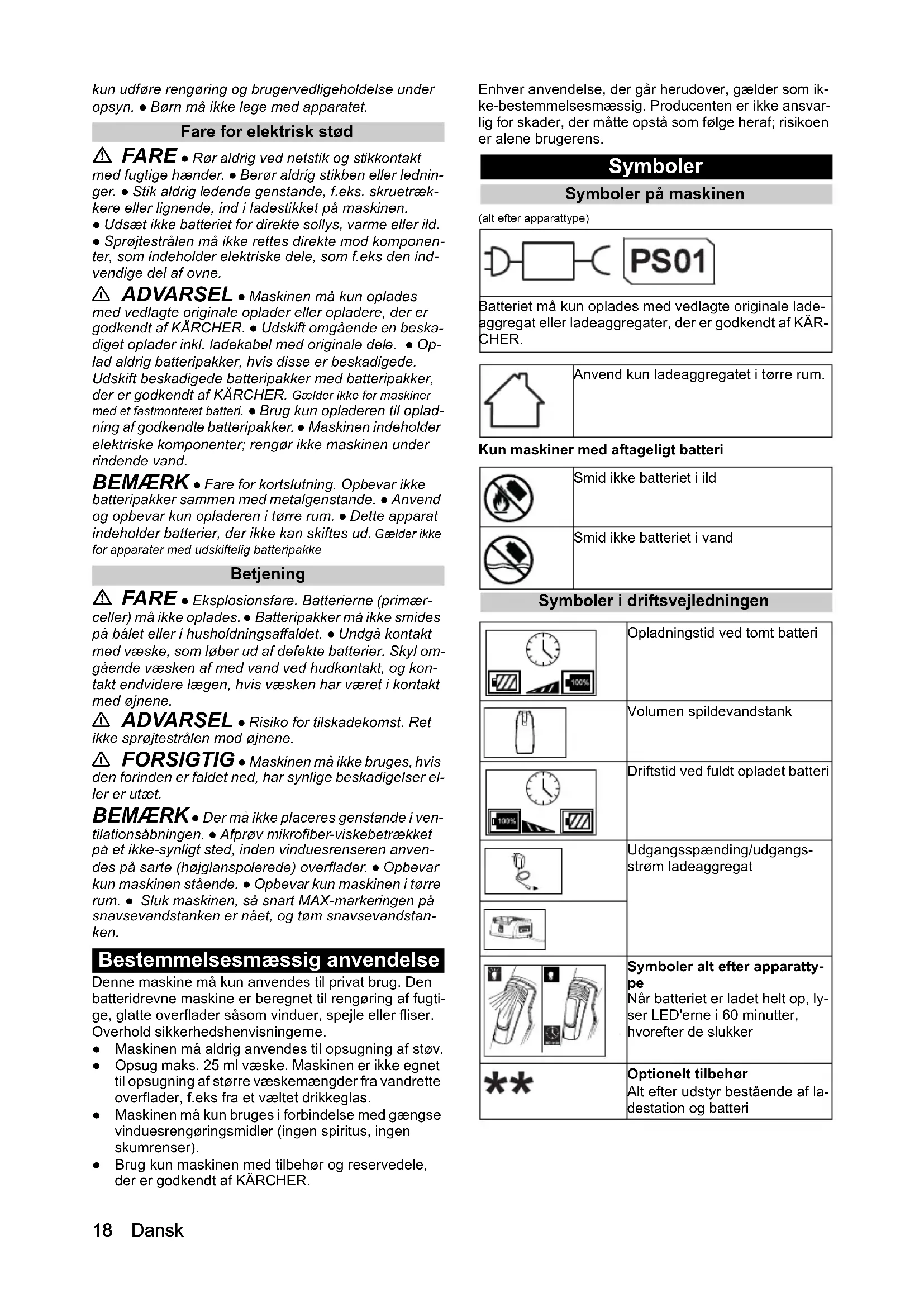 +18 Dansk kun udføre rengøring og brugervedligeholdelse under opsyn. ● Børn må ikke lege med apparatet. Fare for elektrisk stød FARE ● Rør aldrig ved netstik og stikkontakt med fugtige hænder. ● Berør aldrig stikben eller lednin- ger. ● Stik aldrig ledende genstande, f.eks. skruetræk- kere eller lignende, ind i ladestikket på maskinen. ● Udsæt ikke batteriet for direkte sollys, varme eller ild. ● Sprøjtestrålen må ikke rettes direkte mod komponen- ter, som indeholder elektriske dele, som f.eks den ind- vendige del af ovne. 몇 ADVARSEL ● Maskinen må kun oplades med vedlagte originale oplader eller opladere, der er godkendt af KÄRCHER. ● Udskift omgående en beska- diget oplader inkl. ladekabel med originale dele. ● Op- lad aldrig batteripakker, hvis disse er beskadigede. Udskift beskadigede batteripakker med batteripakker, der er godkendt af KÄRCHER. Gælder ikke for maskiner med et fastmonteret batteri. ● Brug kun opladeren til oplad- ning af godkendte batteripakker. ● Maskinen indeholder elektriske komponenter; rengør ikke maskinen under rindende vand. BEMÆRK ● Fare for kortslutning. Opbevar ikke batteripakker sammen med metalgenstande. ● Anvend og opbevar kun opladeren i tørre rum. ● Dette apparat indeholder batterier, der ikke kan skiftes ud. Gælder ikke for apparater med udskiftelig batteripakke Betjening FARE ● Eksplosionsfare. Batterierne (primær- celler) må ikke oplades. ● Batteripakker må ikke smides på bålet eller i husholdningsaffaldet. ● Undgå kontakt med væske, som løber ud af defekte batterier. Skyl om- gående væsken af med vand ved hudkontakt, og kon- takt endvidere lægen, hvis væsken har været i kontakt med øjnene. 몇 ADVARSEL ● Risiko for tilskadekomst. Ret ikke sprøjtestrålen mod øjnene. 몇 FORSIGTIG ● Maskinen må ikke bruges, hvis den forinden er faldet ned, har synlige beskadigelser el- ler er utæt. BEMÆRK ● Der må ikke placeres genstande i ven- tilationsåbningen. ● Afprøv mikrofiber-viskebetrækket på et ikke-synligt sted, inden vinduesrenseren anven- des på sarte (højglanspolerede) overflader. ● Opbevar kun maskinen stående. ● Opbevar kun maskinen i tørre rum. ● Sluk maskinen, så snart MAX-markeringen på snavsevandstanken er nået, og tøm snavsevandstan- ken. Bestemmelsesmæssig anvendelse Denne maskine må kun anvendes til privat brug. Den batteridrevne maskine er beregnet til rengøring af fugti- ge, glatte overflader såsom vinduer, spejle eller fliser. Overhold sikkerhedshenvisningerne. ● Maskinen må aldrig anvendes til opsugning af støv. ● Opsug maks. 25 ml væske. Maskinen er ikke egnet til opsugning af større væskemængder fra vandrette overflader, f.eks fra et væltet drikkeglas. ● Maskinen må kun bruges i forbindelse med gængse vinduesrengøringsmidler (ingen spiritus, ingen skumrenser). ● Brug kun maskinen med tilbehør og reservedele, der er godkendt af KÄRCHER. Enhver anvendelse, der går herudover, gælder som ik- ke-bestemmelsesmæssig. Producenten er ikke ansvar- lig for skader, der måtte opstå som følge heraf; risikoen er alene brugerens. Symboler Symboler på maskinen (alt efter apparattype) Kun maskiner med aftageligt batteri Symboler i driftsvejledningen Batteriet må kun oplades med vedlagte originale lade- aggregat eller ladeaggregater, der er godkendt af KÄR- CHER. Anvend kun ladeaggregatet i tørre rum. Smid ikke batteriet i ild Smid ikke batteriet i vand Opladningstid ved tomt batteri Volumen spildevandstank Driftstid ved fuldt opladet batteri Udgangsspænding/udgangs- strøm ladeaggregat Symboler alt efter apparatty-