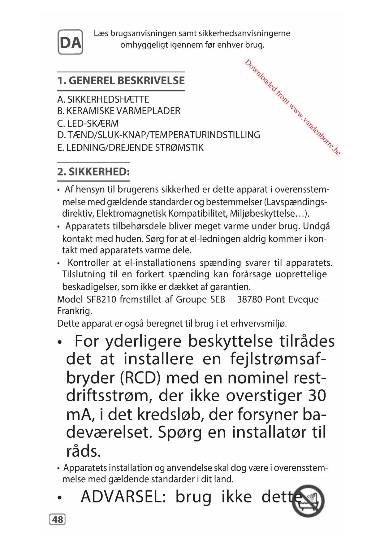 - Kontroller at el-installationens spænding svarer til apparatets. Tilslutning til en forkert spænding kan forårsage uoprettelige beskadigelser, som ikke er dækket af garantien. Model SF8210 fremstillet af Groupe SEB – 38780 Pont Eveque – Frankrig. Dette apparat er også beregnet til brug i et erhvervsmiljø.