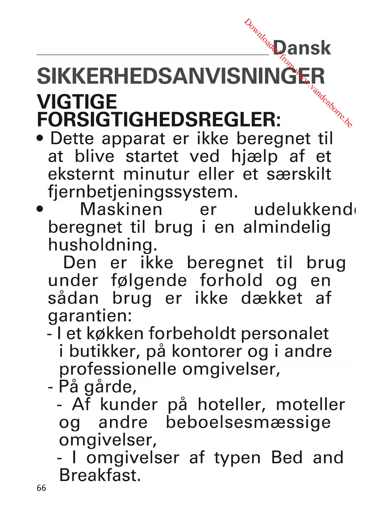 - Maskinen er udelukkende beregnet til brug i en almindelig husholdning. Den er ikke beregnet til brug under følgende forhold og en sådan brug er ikke dækket af garantien: - I et køkken forbeholdt personalet i butikker, på kontorer og i andre professionelle omgivelser, - På gårde, - Af kunder på hoteller, moteller og andre beboelsesmæssige omgivelser, - I omgivelser af typen Bed and Breakfast.
