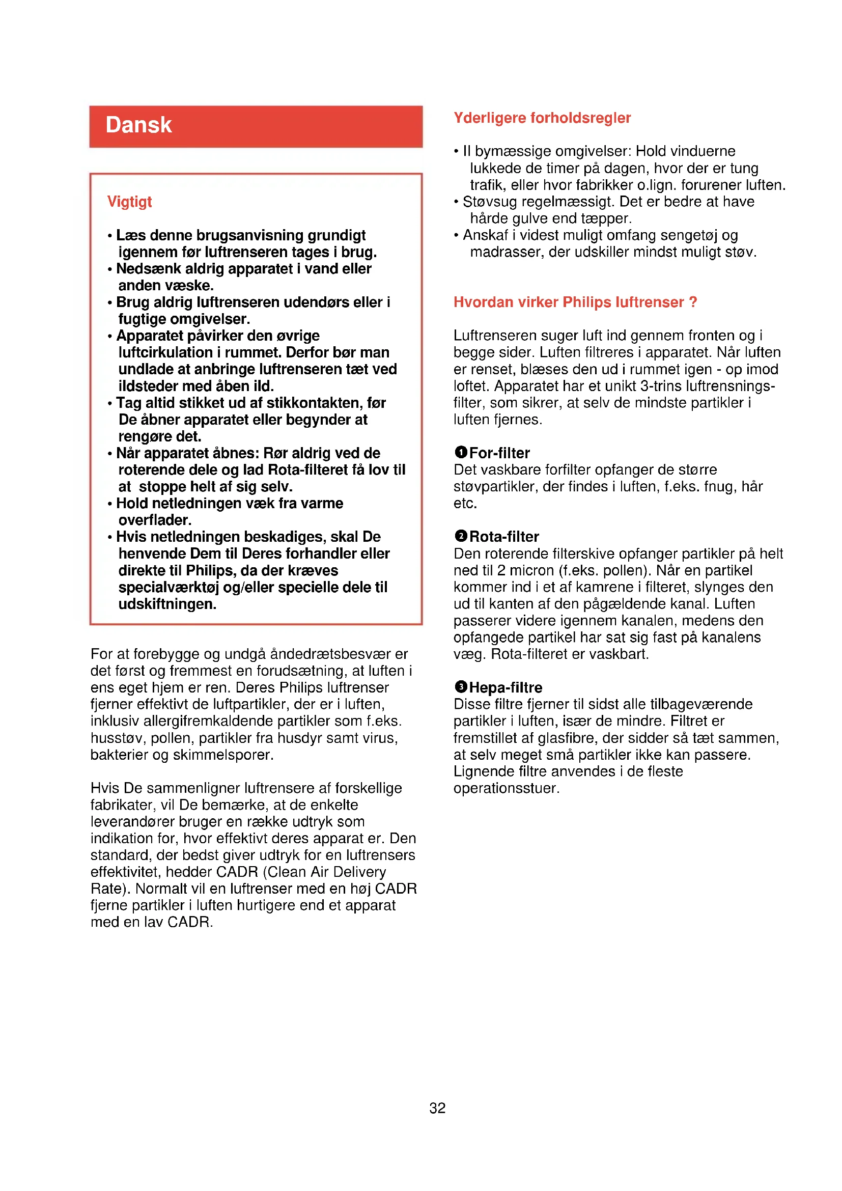 - Anskaf i videst muligt omfang sengetøj og madrasser, der udskiller mindst muligt støv. Hvordan virker Philips luftrenser ? Luftrenseren suger luft ind gennem fronten og i begge sider. Luften filtreres i apparatet. Når luften er renset, blæses den ud i rummet igen - op imod loftet. Apparatet har et unikt 3-trins luftrensnings- filter, som sikrer, at selv de mindste partikler i luften fjernes. 1 For-filter Det vaskbare forfilter opfanger de større støvpartikler, der findes i luften, f.eks. fnug, hår etc. 2 Rota-filter Den roterende filterskive opfanger partikler på helt ned til 2 micron (f.eks. pollen). Når en partikel kommer ind i et af kamrene i filteret, slynges den ud til kanten af den pågældende kanal. Luften passerer videre igennem kanalen, medens den opfangede partikel har sat sig fast på kanalens væg. Rota-filteret er vaskbart. 3 Hepa-filtre Disse filtre fjerner til sidst alle tilbageværende partikler i luften, især de mindre. Filtret er fremstillet af glasfibre, der sidder så tæt sammen, at selv meget små partikler ikke kan passere. Lignende filtre anvendes i de fleste operationsstuer. Dansk For at forebygge og undgå åndedrætsbesvær er det først og fremmest en forudsætning, at luften i ens eget hjem er ren. Deres Philips luftrenser fjerner effektivt de luftpartikler, der er i luften, inklusiv allergifremkaldende partikler som f.eks. husstøv, pollen, partikler fra husdyr samt virus, bakterier og skimmelsporer. Hvis De sammenligner luftrensere af forskellige fabrikater, vil De bemærke, at de enkelte leverandører bruger en række udtryk som indikation for, hvor effektivt deres apparat er. Den standard, der bedst giver udtryk for en luftrensers effektivitet, hedder CADR (Clean Air Delivery Rate). Normalt vil en luftrenser med en høj CADR fjerne partikler i luften hurtigere end et apparat med en lav CADR.33 Generel beskrivelse (fig. 1)