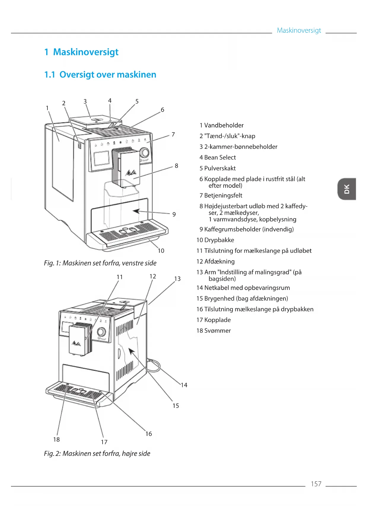 Fig. 2: Maskinen set forfra, højre side 1 Vandbeholder 2 "Tænd-/sluk"-knap 3 2-kammer-bønnebeholder 4 Bean Select 5 Pulverskakt 6 Kopplade med plade i rustfrit stål (alt efter model) 7 Betjeningsfelt 8 Højdejusterbart udløb med 2 kaedy- ser, 2 mælkedyser, 1 varmvandsdyse, kopbelysning 9 Kaegrumsbeholder (indvendig) 10 Drypbakke 11 Tilslutning for mælkeslange på udløbet 12 Afdækning 13 Arm "Indstilling af malingsgrad" (på bagsiden) 14 Netkabel med opbevaringsrum 15 Brygenhed (bag afdækningen) 16 Tilslutning mælkeslange på drypbakken 17 Kopplade 18 SvømmerMaskinoversigt