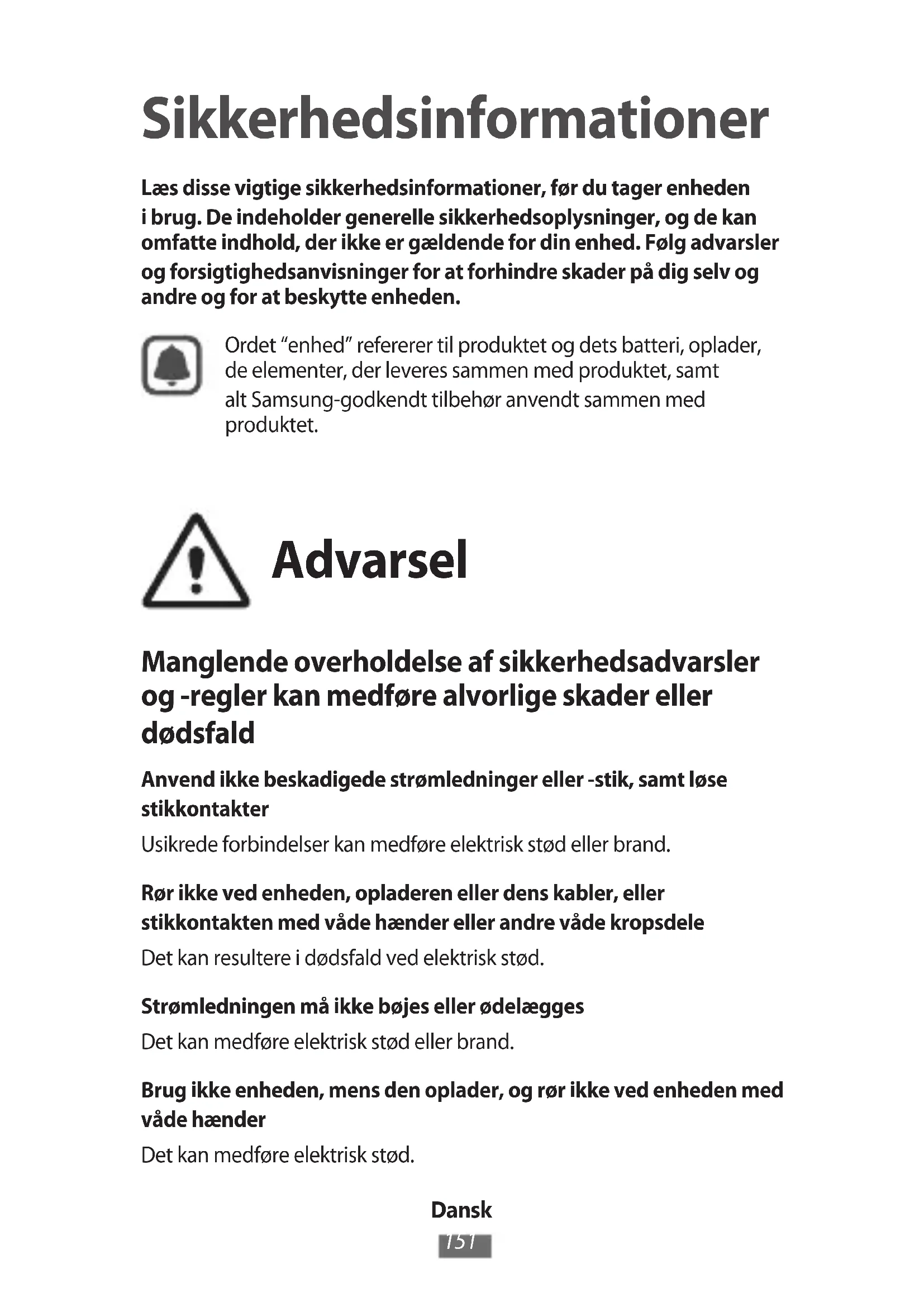 Sikkerhedsinformationer Læs disse vigtige sikkerhedsinformationer, før du tager enheden i brug. De indeholder generelle sikkerhedsoplysninger, og de kan omfatte indhold, der ikke er gældende for din enhed. Følg advarsler og forsigtighedsanvisninger for at forhindre skader på dig selv og andre og for at beskytte enheden. Ordet “enhed” refererer til produktet og dets batteri, oplader, de elementer, der leveres sammen med produktet, samt alt Samsung-godkendt tilbehør anvendt sammen med produktet. Advarsel Manglende overholdelse af sikkerhedsadvarsler og -regler kan medføre alvorlige skader eller dødsfald Anvend ikke beskadigede strømledninger eller -stik, samt løse stikkontakter Usikrede forbindelser kan medføre elektrisk stød eller brand. Rør ikke ved enheden, opladeren eller dens kabler, eller stikkontakten med våde hænder eller andre våde kropsdele Det kan resultere i dødsfald ved elektrisk stød. Strømledningen må ikke bøjes eller ødelægges Det kan medføre elektrisk stød eller brand. Brug ikke enheden, mens den oplader, og rør ikke ved enheden med våde hænder Det kan medføre elektrisk stød.Dansk