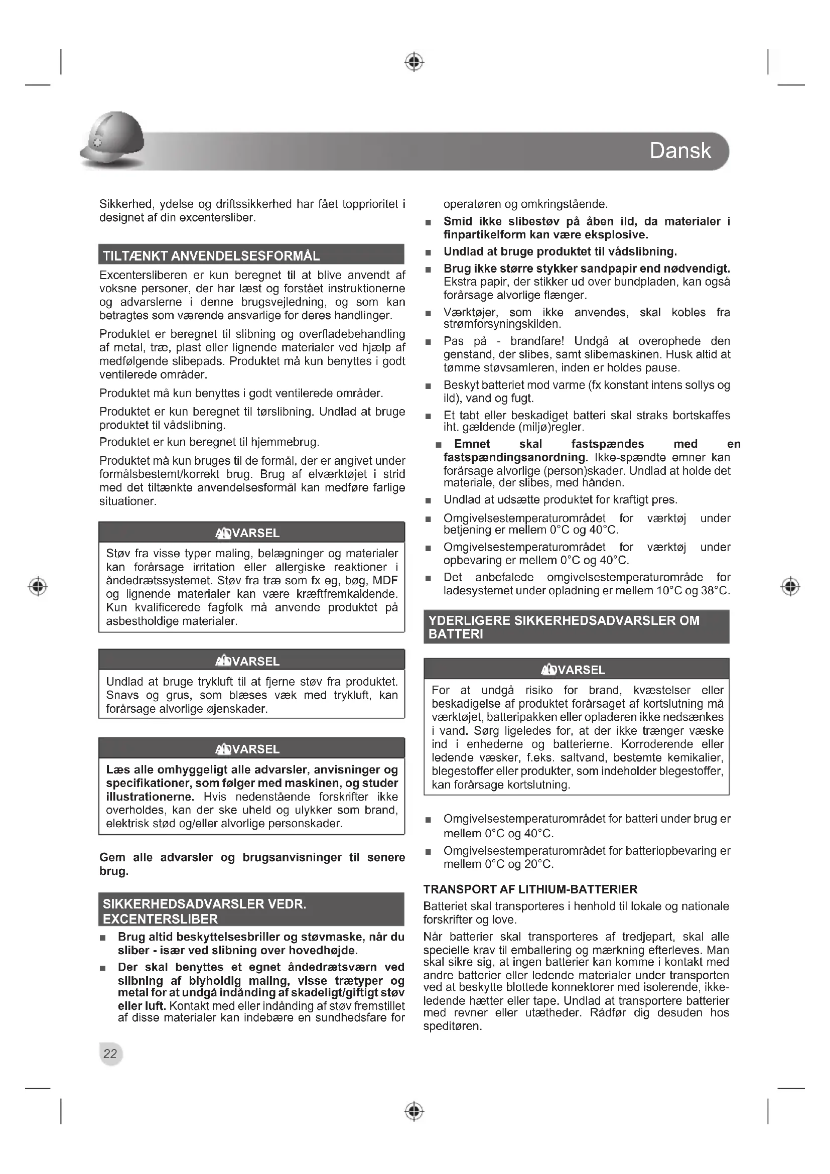 Excentersliberen er kun beregnet til at blive anvendt af voksne personer, der har læst og forstået instruktionerne og advarslerne i denne brugsvejledning, og som kan betragtes som værende ansvarlige for deres handlinger. Produktet er beregnet til slibning og overfladebehandling af metal, træ, plast eller lignende materialer ved hjælp af medfølgende slibepads. Produktet må kun benyttes i godt ventilerede områder. Produktet må kun benyttes i godt ventilerede områder. Produktet er kun beregnet til tørslibning. Undlad at bruge produktet til vådslibning. Produktet er kun beregnet til hjemmebrug. Produktet må kun bruges til de formål, der er angivet under formålsbestemt/korrekt brug. Brug af elværktøjet i strid med det tiltænkte anvendelsesformål kan medføre farlige situationer. ADVARSEL Støv fra visse typer maling, belægninger og materialer kan forårsage irritation eller allergiske reaktioner i åndedrætssystemet. Støv fra træ som fx eg, bøg, MDF og lignende materialer kan være kræftfremkaldende. Kun kvalificerede fagfolk må anvende produktet på asbestholdige materialer. ADVARSEL Undlad at bruge trykluft til at fjerne støv fra produktet. Snavs og grus, som blæses væk med trykluft, kan forårsage alvorlige øjenskader. ADVARSEL Læs alle omhyggeligt alle advarsler, anvisninger og specifikationer, som følger med maskinen, og studer illustrationerne. Hvis nedenstående forskrifter ikke overholdes, kan der ske uheld og ulykker som brand, elektrisk stød og/eller alvorlige personskader. Gem alle advarsler og brugsanvisninger til senere brug. SIKKERHEDSADVARSLER VEDR. EXCENTERSLIBER Ŷ Brug altid beskyttelsesbriller og støvmaske, når du sliber - især ved slibning over hovedhøjde. Ŷ Der skal benyttes et egnet åndedrætsværn ved slibning af blyholdig maling, visse trætyper og metal for at undgå indånding af skadeligt/giftigt støv eller luft. Kontakt med eller indånding af støv fremstillet af disse materialer kan indebære en sundhedsfare for operatøren og omkringstående. Ŷ Smid ikke slibestøv på åben ild, da materialer i finpartikelform kan være eksplosive. Ŷ Undlad at bruge produktet til vådslibning. Ŷ Brug ikke større stykker sandpapir end nødvendigt. Ekstra papir, der stikker ud over bundpladen, kan også forårsage alvorlige flænger. Ŷ Værktøjer, som ikke anvendes, skal kobles fra strømforsyningskilden. Ŷ Pas på - brandfare! Undgå at overophede den genstand, der slibes, samt slibemaskinen. Husk altid at tømme støvsamleren, inden er holdes pause. Ŷ Beskyt batteriet mod varme (fx konstant intens sollys og ild), vand og fugt. Ŷ Et tabt eller beskadiget batteri skal straks bortskaffes iht. gældende (miljø)regler. Ŷ Emnet skal fastspændes med en fastspændingsanordning. Ikke-spændte emner kan forårsage alvorlige (person)skader. Undlad at holde det materiale, der slibes, med hånden. Ŷ Undlad at udsætte produktet for kraftigt pres. Ŷ Omgivelsestemperaturområdet for værktøj under betjening er mellem 0°C og 40°C. Ŷ Omgivelsestemperaturområdet for værktøj under opbevaring er mellem 0°C og 40°C. Ŷ Det anbefalede omgivelsestemperaturområde for ladesystemet under opladning er mellem 10°C og 38°C.