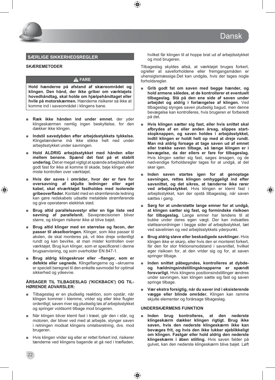 SYMBOLER Sikkerheds Varsel Træ Undlad at skære i metal Benyt høreværn Benyt øjenværn Laserstråling. Se aldrig direkte ind i strålen. Klasse 2-laserprodukt λ: 650nm; P≤1mW EN 60825-1:2007 Fare! Skarp klinge. Må ikke udsættes for regn Snitbredde Klingetænder Klasse II, dobbeltisoleret CE Overensstemmelse GOST-R Overensstemmelse Læs venligst vejledningen grundigt igennem før maskinen tages i brug. Elektriske affaldsprodukter bør ikke afskaffes sammen med husholdningsaffald. Genbrug venligst hvor faciliteterne tillader dette. Tjek med din lokale kommune eller forhandler for genbrugsråd.