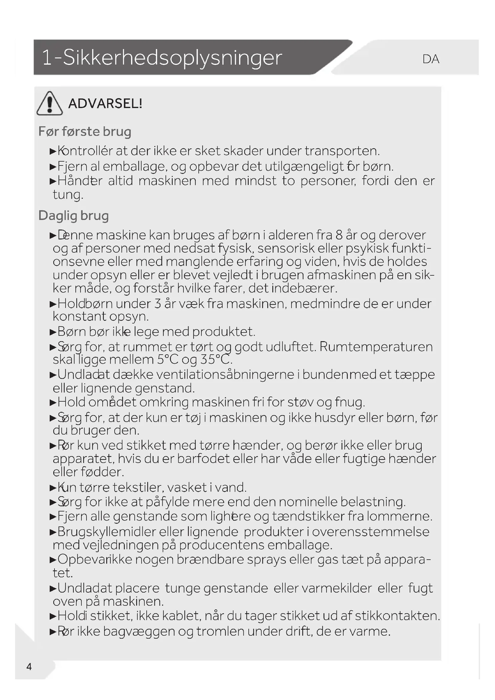 ADVARSEL! Før første brug ▶ K ontrollér at der ikke er sket skader under transporten. ▶ Fjern al emballage, og opbevar det utilgængeligt f or børn. ▶ Håndt er altid maskinen med mindst to personer, fordi den er tung. Daglig brug ▶ D enne maskine kan bruges af børn i alderen fra 8 år og derover og af personer med nedsat fysisk, sensorisk eller psykisk funkti- onsevne eller med manglende erfaring og viden, hvis de holdes under opsyn eller er blevet vejledt i brugen af