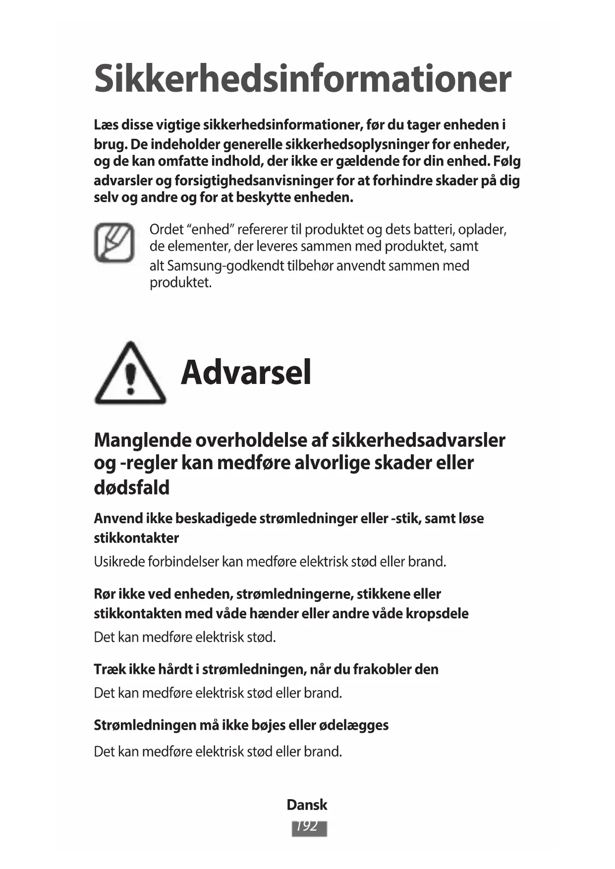 Sikkerhedsinformationer Læs disse vigtige sikkerhedsinformationer, før du tager enheden i brug. De indeholder generelle sikkerhedsoplysninger for enheder, og de kan omfatte indhold, der ikke er gældende for din enhed. Følg advarsler og forsigtighedsanvisninger for at forhindre skader på dig selv og andre og for at beskytte enheden. Ordet “enhed” refererer til produktet og dets batteri, oplader, de elementer, der leveres sammen med produktet, samt alt Samsung-godkendt tilbehør anvendt sammen med produktet. Advarsel Manglende overholdelse af sikkerhedsadvarsler og -regler kan medføre alvorlige skader eller dødsfald Anvend ikke beskadigede strømledninger eller -stik, samt løse stikkontakter Usikrede forbindelser kan medføre elektrisk stød eller brand. Rør ikke ved enheden, strømledningerne, stikkene eller stikkontakten med våde hænder eller andre våde kropsdele Det kan medføre elektrisk stød. Træk ikke hårdt i strømledningen, når du frakobler den Det kan medføre elektrisk stød eller brand. Strømledningen må ikke bøjes eller ødelægges Det kan medføre elektrisk stød eller brand.Dansk