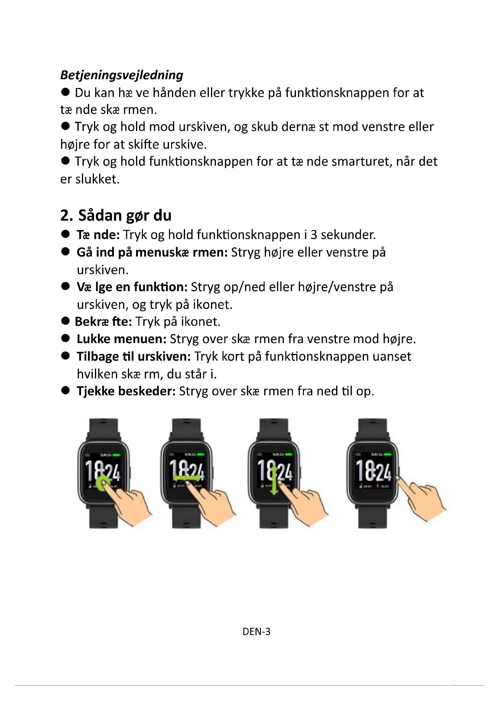 Tæ nde: Tryk og hold funktionsknappen i 3 sekunder. Gå ind på menuskæ rmen: Stryg højre eller venstre på urskiven. Væ lge en funktion: Stryg op/ned eller højre/venstre på urskiven, og tryk på ikonet. Bekræ fte: Tryk på ikonet. Lukke menuen: Stryg over skæ rmen fra venstre mod højre. Tilbage til urskiven: Tryk kort på funktionsknappen uanset hvilken skæ rm, du står i. Tjekke beskeder: Stryg over skæ rmen fra ned til op.DEN-4